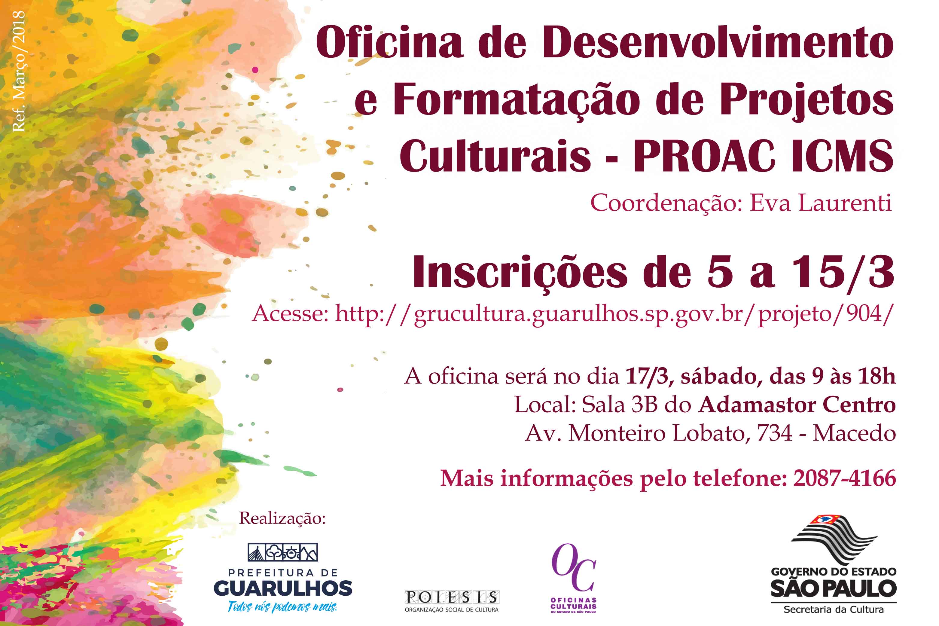 Entre os dias 5 e 15 de março, a Prefeitura de Guarulhos abre inscrições para a oficina gratuita de “Técnica para Desenvolvimento e Formatação de Projetos Culturais”. Coordenada pela consultora de Comunicação Eva Laurenti, a atividade será no dia 17 de março, sábado, das 9 às 18h, no Auditório 3-B, do Adamastor Centro.