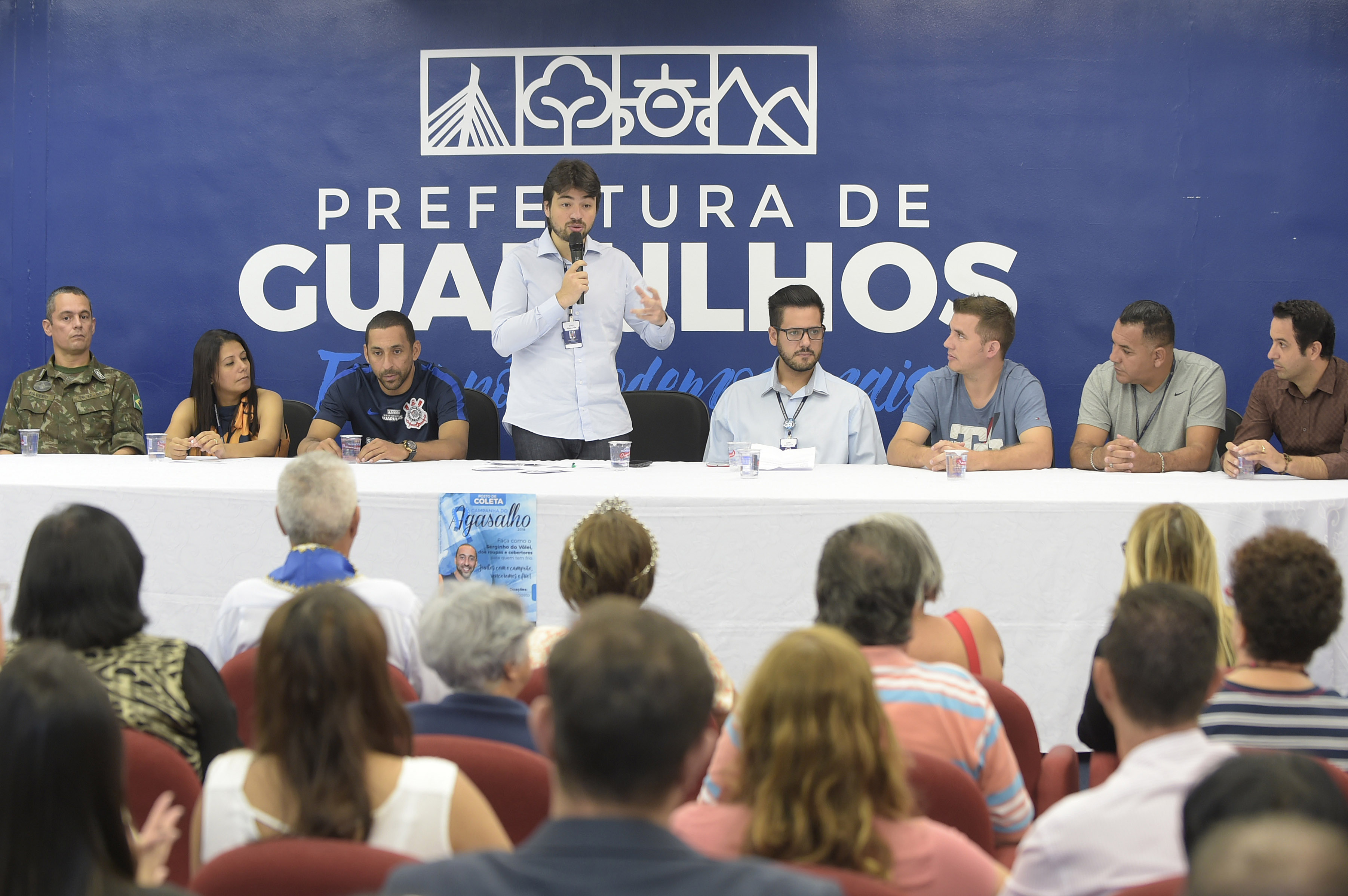 O lançamento oficial da Campanha do Agasalho 2018 de Guarulhos “Juntos com o campeão, venceremos o frio!” ocorreu nesta quarta-feira, dia 21, com as presenças do prefeito Guti, embaixador oficial da campanha, o jogador de vôlei Serginho, e tropa do Tiro de Guerra que entoou os hinos Nacional e de Guarulhos, no auditório do Paço Municipal. A meta de arrecadação, coordenada pelo Fundo Social de Solidariedade, é de 500 mil peças, lembrando que ano passado foram recebidas 300 mil peças.