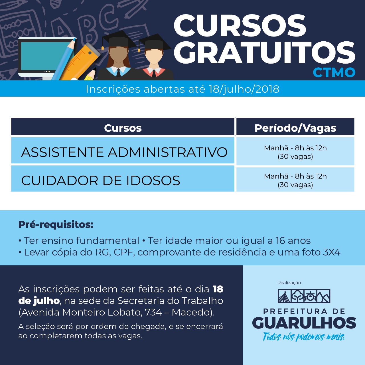 Em parceria com o Governo do Estado, a Secretaria do Trabalho de Guarulhos disponibiliza mais 60 vagas para os cursos de Assistente Administrativo (30 vagas) e Cuidador de Idosos (30 vagas), que serão ministrados na unidade do Centro de Treinamento de Mão de Obra (CTMO) Vila Augusta (Rua Antonio Iervolino, 225 – Vila Augusta), das 8h às 12h, entre os dias 6 e 31 de Agosto.