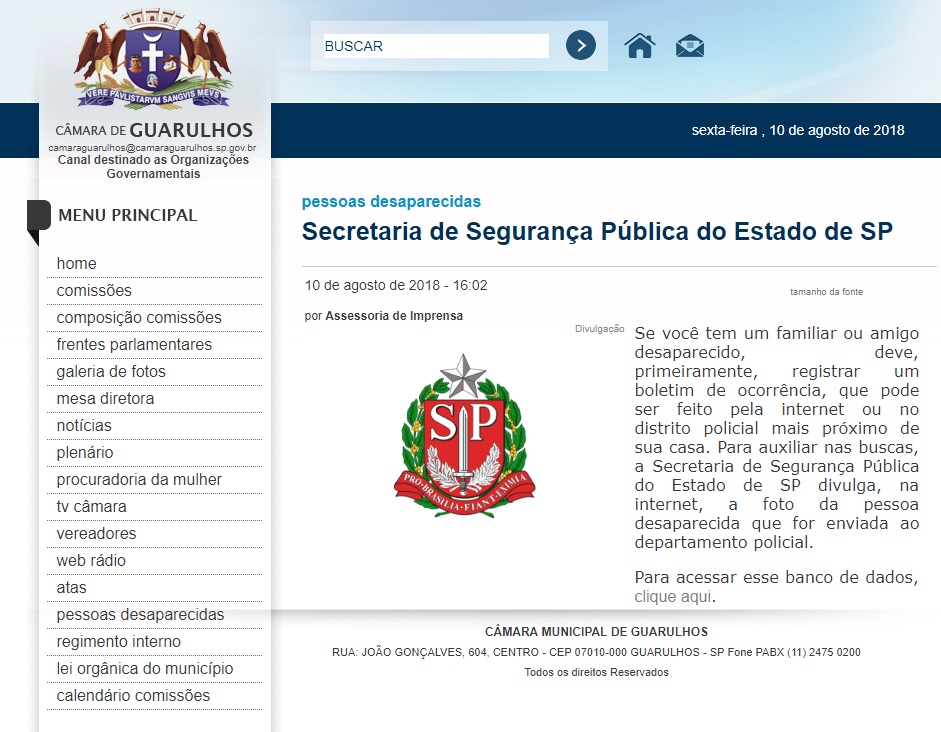 Foi criado um novo espaço, “Pessoas Desaparecidas” no site da Câmara de Guarulhos (www.camaraguarulhos.sp.gov.br). Nessa área, que pode ser acessada no menu lateral ou na parte inferior da homepage, o internauta pode consultar informações e links de três órgãos que cuidam deste assunto: a Secretaria de Segurança Pública do Estado de São Paulo, a Delegacia de Cadastro Nacional de Pessoas Desaparecidas, vinculada ao Ministério da Justiça, e a Associação Desaparecidos do Brasil, organização sem fins lucrativos.