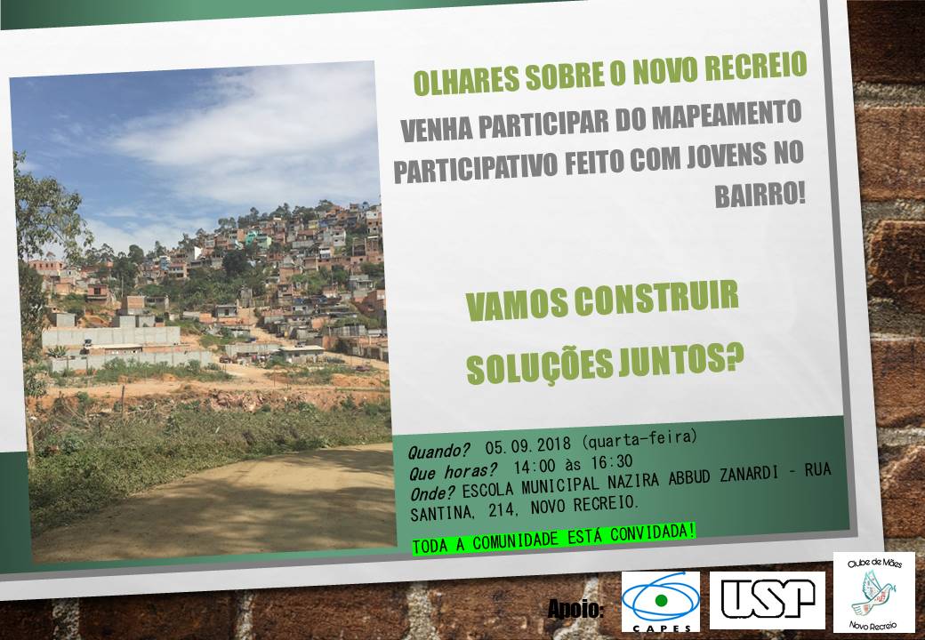 O Serviço Autônomo de Água e Esgoto (Saae) de Guarulhos e a Universidade de São Paulo (USP) irão participar, nesta quarta-feira, 5 de setembro, da atividade “Olhares sobre o Novo Recreio”, projeto que apresentará o mapeamento participativo do bairro Novo Recreio e que foi desenvolvido com a ajuda dos jovens da comunidade.