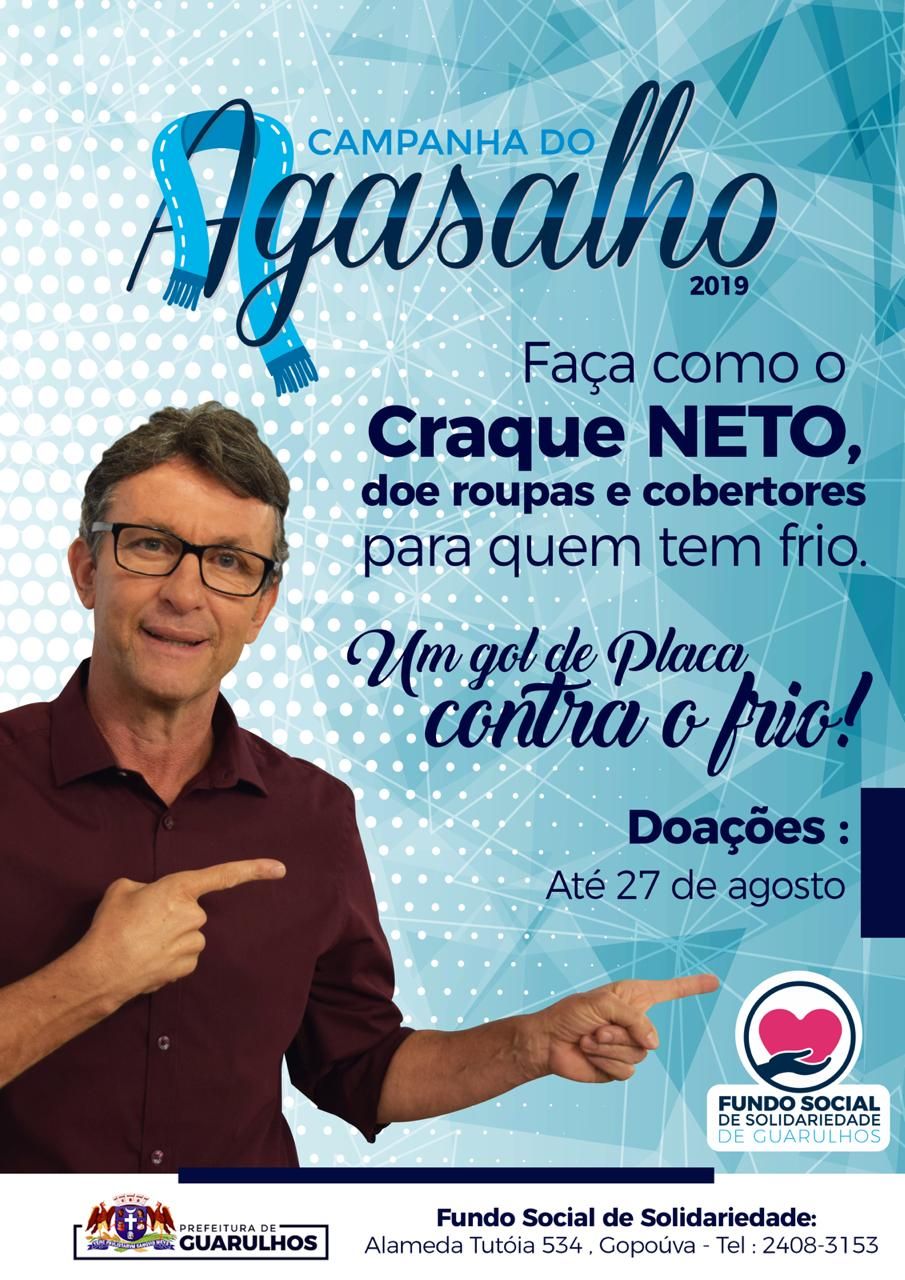 O lançamento oficial da Campanha do Agasalho 2019 de Guarulhos “Um gol de placa contra o frio” será realizado na quinta-feira, dia 2 de maio, às 9h30, no auditório do Paço Municipal. Este ano, a campanha terá como embaixador oficial o Craque Neto, ex- jogador de futebol do Corinthians e atual apresentador e comentarista esportivo, que cedeu sua imagem para os cartazes.