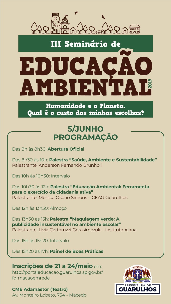 Nesta quarta-feira (5), Dia Mundial do Meio Ambiente, o Adamastor Centro recebe, das 8h às 17h, o “3º Seminário de Educação Ambiental – Humanidade e o Planeta. Qual o custo das minhas escolhas?”. O evento tem entrada livre e gratuita para o público em geral até o limite de 200 vagas. Os demais lugares serão preenchidos por coordenadores, gestores e professores das escolas da Prefeitura de Guarulhos.