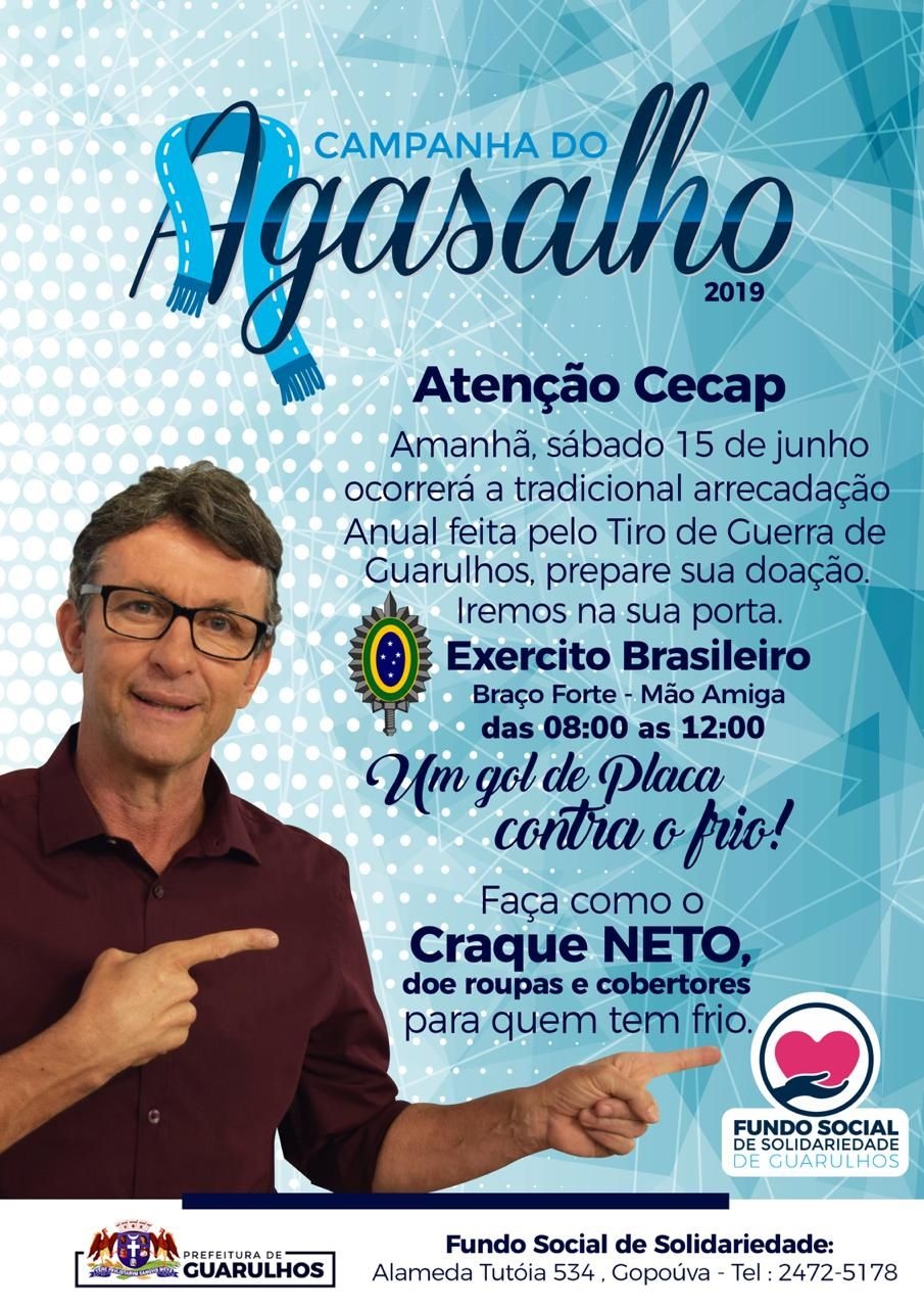 A Campanha do Agasalho 2019 de Guarulhos “Um gol de placa contra o frio” contará com um grande aliado nesta sexta-feira (14): atiradores do Tiro de Guerra irão divulgar a campanha, entregando panfletos em todos os apartamentos do Parque Cecap, a partir das 7h. No sábado (15), das 8h às 12h, a tropa irá recolher em todos os condomínios as doações de roupas, calçados e cobertores. Nesse dia, o ponto de encontro será o Clube do Cecap, onde o Fundo Social de Solidariedade servirá um café da manhã para os atiradores.