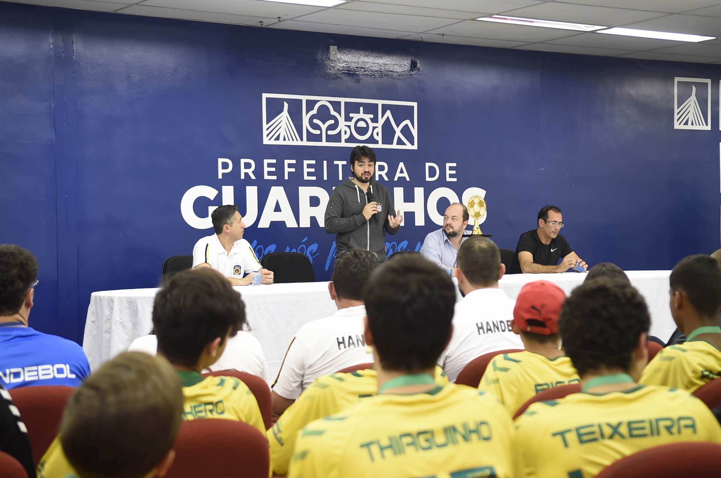 O prefeito Guti recebeu e parabenizou nesta quinta-feira (27) a delegação do Hérkules-Guarulhos, equipe que conquistou no último domingo em Tubarão (SC) o Campeonato Brasileiro de handebol infantil masculino pela primeira vez na história da categoria no município. A cerimônia aconteceu no Paço Municipal, no Bom Clima.