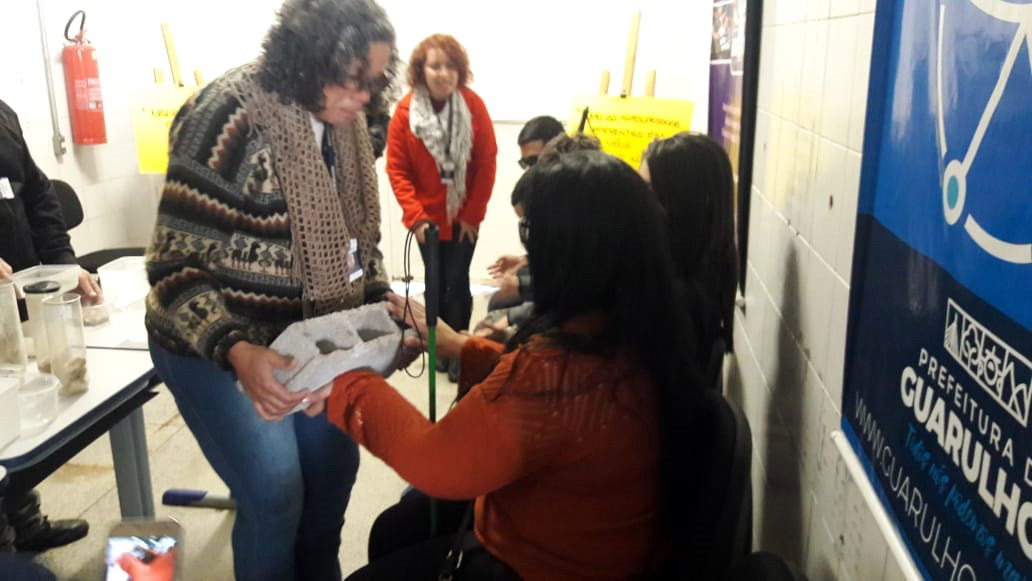 Na ocasião a equipe preparou uma atividade tátil, sem exposição visual, especialmente pensada para o grupo, além de explicar o ciclo de vida dos pneus, do plástico, do isopor e do papel. Todos manusearam os materiais, principalmente os componentes que são usados na formação de um pneu, e aprenderam sobre a destinação de entulhos e todas as possibilidades de reaproveitamento.