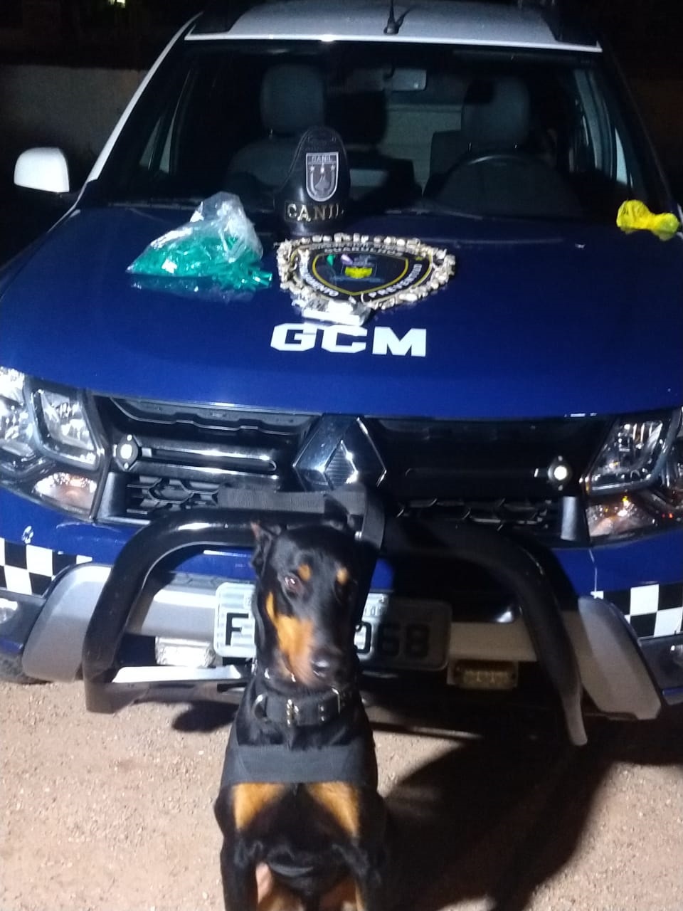 Ao retornarem ao local onde o suspeito se encontrava foi realizada a busca por produtos ilícitos, sendo que o cão dobermann da corporação, chamado Kiron, localizou, entre materiais de construção, uma sacola plástica contendo os itens ilegais que seriam provavelmente utilizados para comercialização.