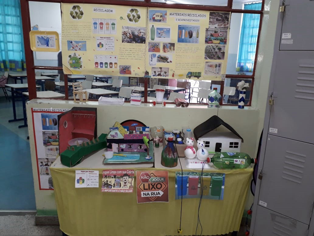 Maquetes, cartazes e objetos do projeto foram elaborados com muita criatividade pelos alunos, ressaltando quais são os materiais reciclados e os reaproveitados por meio de um painel de fotografias com obras de arte feitas com material reciclado.