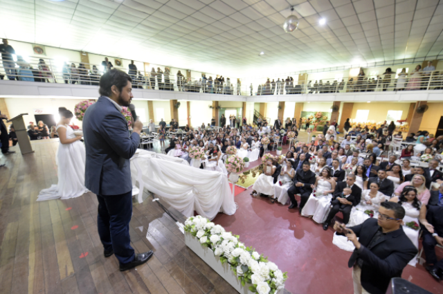 Alegria e lágrimas contagiaram um público de 600 pessoas que prestigiou e se emocionou na 9ª edição do Casamento Comunitário de Guarulhos neste domingo (18) no Nosso Clube Vila Galvão. Comandada pelo presidente da Convenção-Geral da Assembleia de Deus no Brasil, pastor José Wellington Costa Júnior, a cerimônia ecumênica reuniu 46 casais e contou com a participação do prefeito Gutie da presidente do Fundo Social de Solidariedade, Elen Farias, como padrinhos do casal-símbolo Suelen de Andrade Benedito (25 anos) e Emerson Ramos (35), escolhidos pela organização.