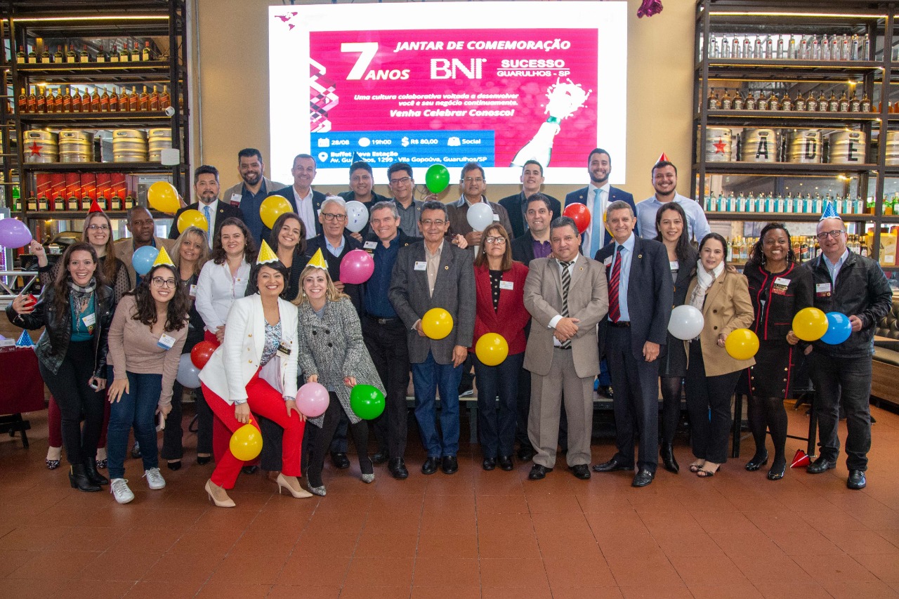 A equipe BNI Sucesso – pioneira da franquia em Guarulhos – completa 7 anos de atividades neste mês de agosto. Na próxima quarta-feira, 28, membros e diretores realizam evento comemorativo para empresários convidados no Buffet Nova Estação, na Vila Augusta.