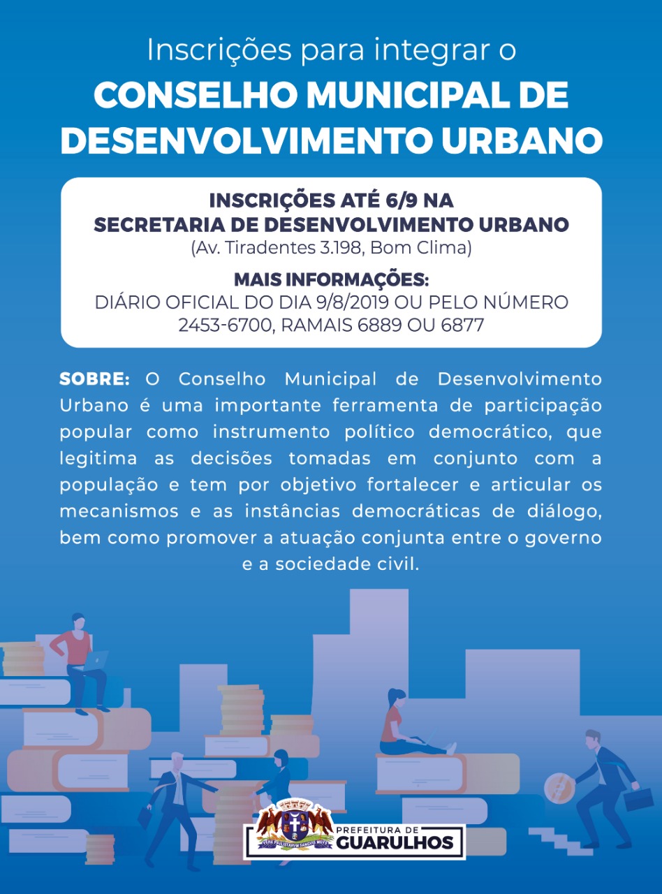 A Prefeitura de Guarulhos receberá até a próxima sexta-feira (6) as inscrições para a escolha das entidades representantes titulares e suplentes da sociedade civil junto ao Conselho Municipal de Desenvolvimento Urbano (CMDU). As informações foram publicadas no Diário Oficial de 9 de agosto e as inscrições devem ser realizadas na Secretaria de Desenvolvimento Urbano (avenida Tiradentes, 3.198, Bom Clima).