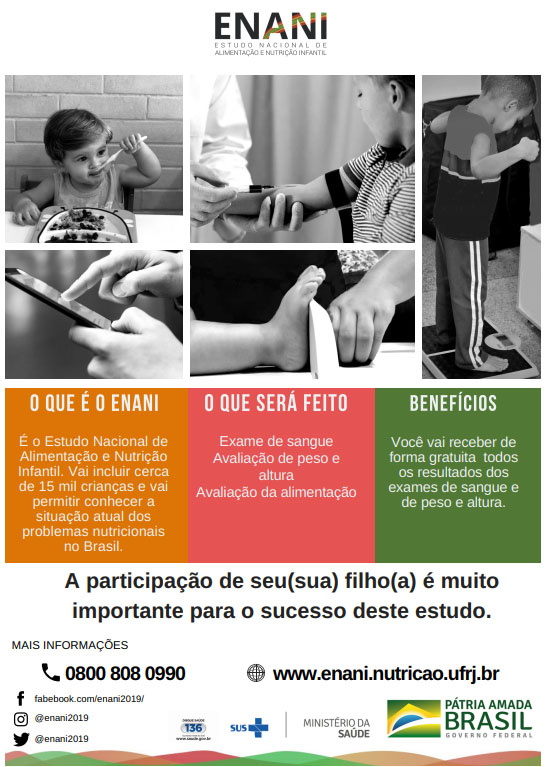 O Estudo Nacional de Alimentação e Nutrição Infantil (Enani), pesquisa da UFRJ encomendada pelo Ministério da Saúde, chega a Guarulhos. Em todo o estado de São Paulo, serão percorridos 1.530 domicílios de 14 cidades, até o final deste mês. Essa é a quinta fase do inquérito, que, pela primeira vez no país, coletará informações detalhadas sobre hábitos alimentares, peso e altura de crianças de até cinco anos. Também serão realizados exames de sangue nos participantes com mais de seis meses de vida e o mapeamento sanguíneo de 12 micronutrientes, como os minerais zinco e selênio, e vitaminas do complexo B, além de investigadas informações sobre amamentação, doação de leite humano, consumo de suplementos de vitaminas e minerais, habilidades culinárias, ambiente alimentar e condições sociais da família. Ao todo, 15 mil famílias serão visitadas pelos pesquisadores do Enani, em 123 municípios brasileiros. A Prefeitura de Guarulhos está apoiando a iniciativa através da divulgação.