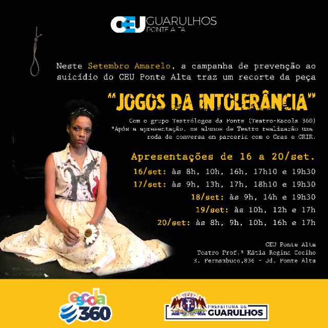 Dentre as ações do CEU Ponte Alta, os alunos de teatro dos módulos2 e 3 farão um recorte da peça Jogos da Intolerância, que aborda temas como homofobia, machismo e depressão, oferecendo ainda uma visão aprofundada sobre a intolerância do ser humano e a sua falta de habilidade para compreender e respeitar as diferenças.