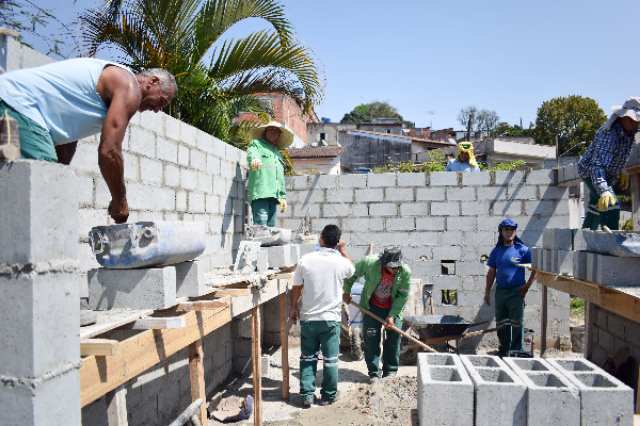 Servidores trabalham na construção de uma edificação de apoio às pessoas que atuam no local. As próximas fases da obra contemplarãoa readequação do piso interno, com a construção de 104m² de baias para o recebimento de volumosos, como sofás e resíduos secos recicláveis (papel, lata, vidro e plástico), e uma baia de 24m² para caçambas estacionárias do tipo roll on.
