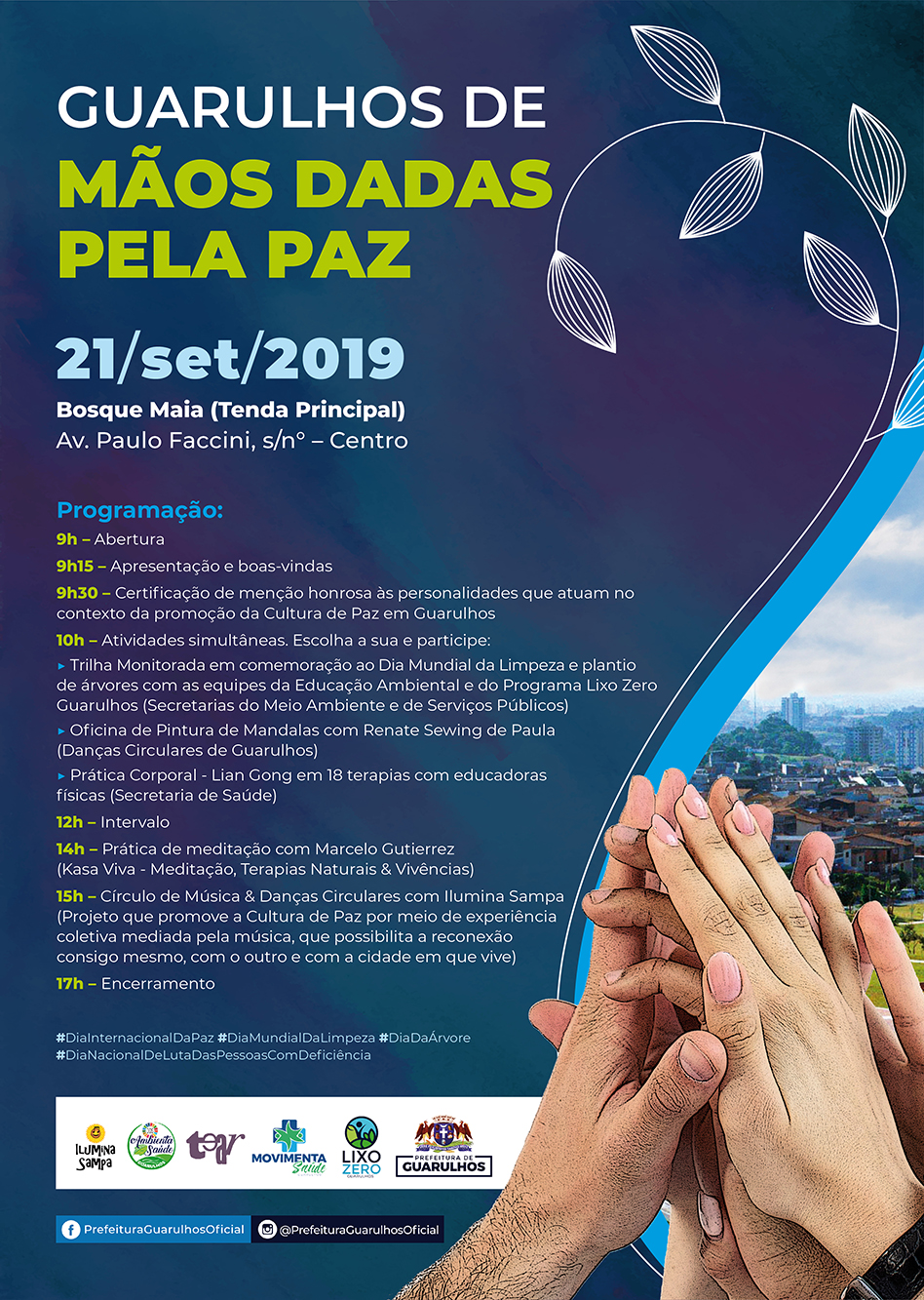 Em comemoração ao Dia Internacional da Paz, celebrado em todo o mundo em 21 de setembro, as secretarias de Saúde, Direitos Humanos, Serviços Públicos e Meio Ambiente, em parceria com a OAB Guarulhos, realizarão o evento gratuito “Guarulhos de Mãos Dadas Pela Paz”, neste sábado, das 9h às 17h, na tenda principal do Bosque Maia. A programação traz atividades para promoção da cultura de paz e do desenvolvimento sustentável, já que neste dia também são celebrados o Dia Mundial da Limpeza, o Dia da Árvore e o Dia Nacional de Luta das Pessoas com Deficiência.