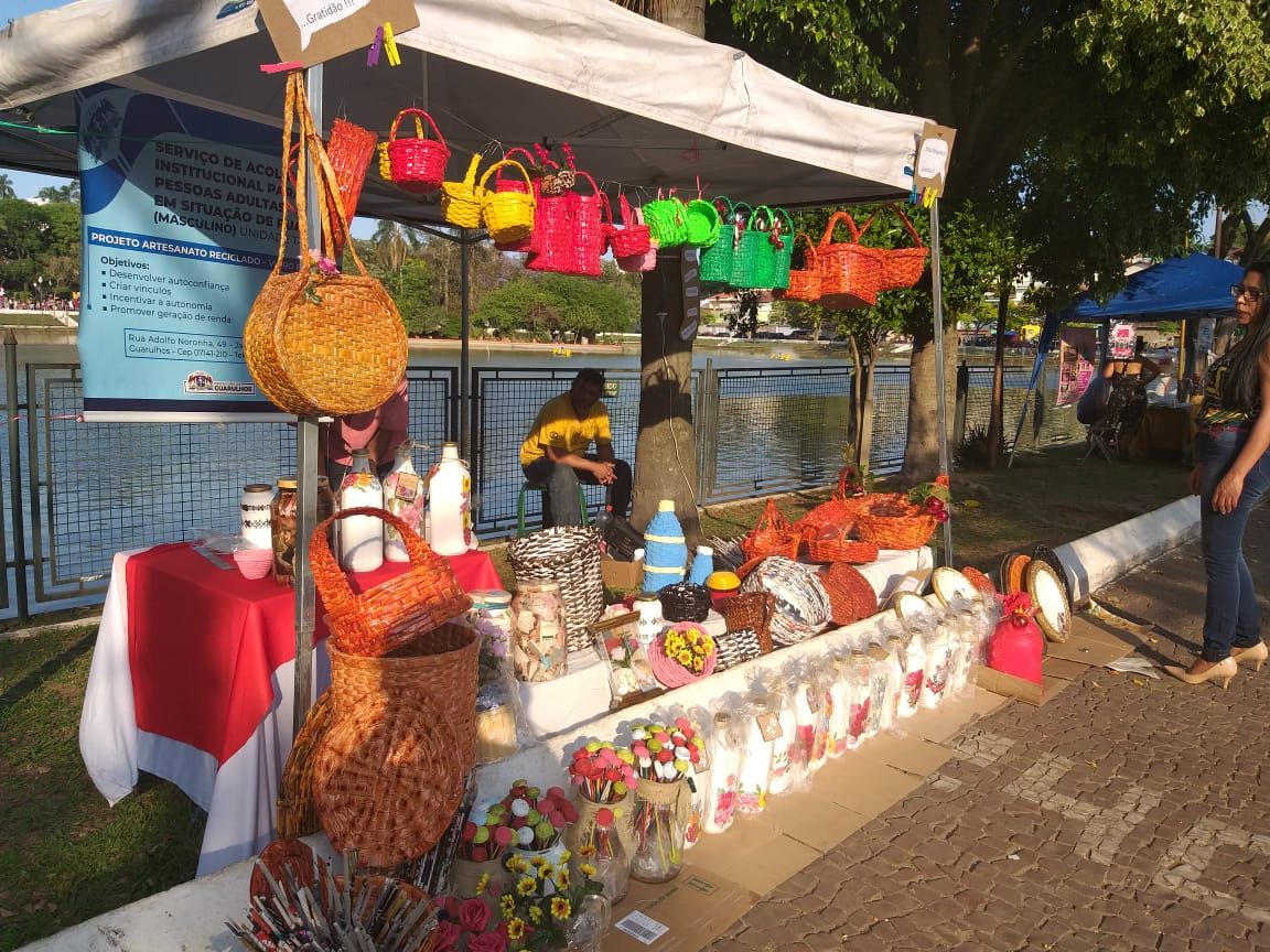 Usuários do Serviço Institucional de Acolhimento Adulto Masculino do Taboão, conhecido como Casa de Acolhimento Taboão,participaram neste sábado e domingo, dias 12 e 13, da feira de artesanato no Lago dos Patos, na Vila Galvão. Os assistidos do serviço da Prefeitura puseram à venda produtos como garrafas e potes de vidro decorados, sousplat e cestaria de jornal, os quais foram confeccionados nas oficinas de artesanato socioeducativas da unidade.