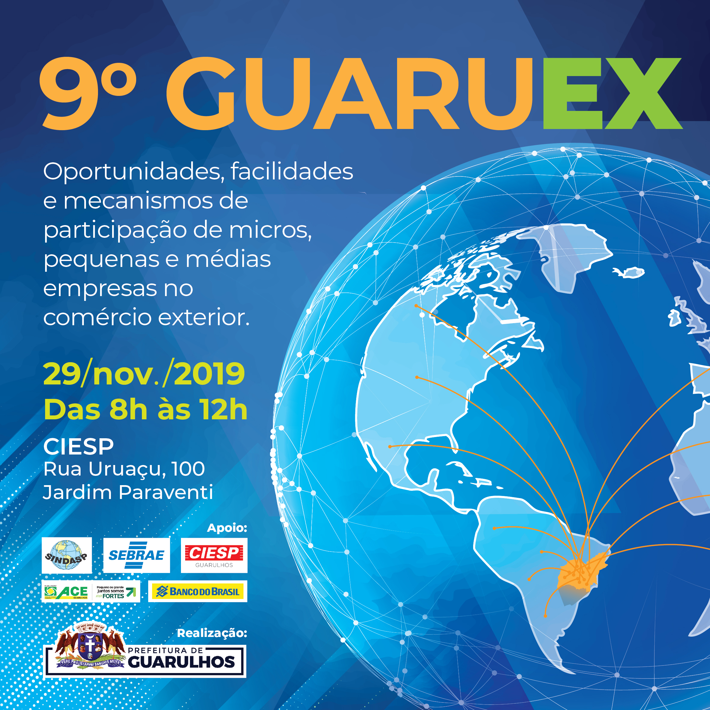 No próximo dia 29 de novembro, acontece a 9ª edição da Guaruex, na sede da CIESP, em Guarulhos, a partir das 8h. O evento será realizado pelo departamento de Relações Econômicas da Secretaria de Desenvolvimento Cientifico, Econômico e Tecnológico e Inovação (SDCETI) e reunirá as principais lideranças empresariais da cidade para tratar de assuntos relacionados ao comércio exterior.