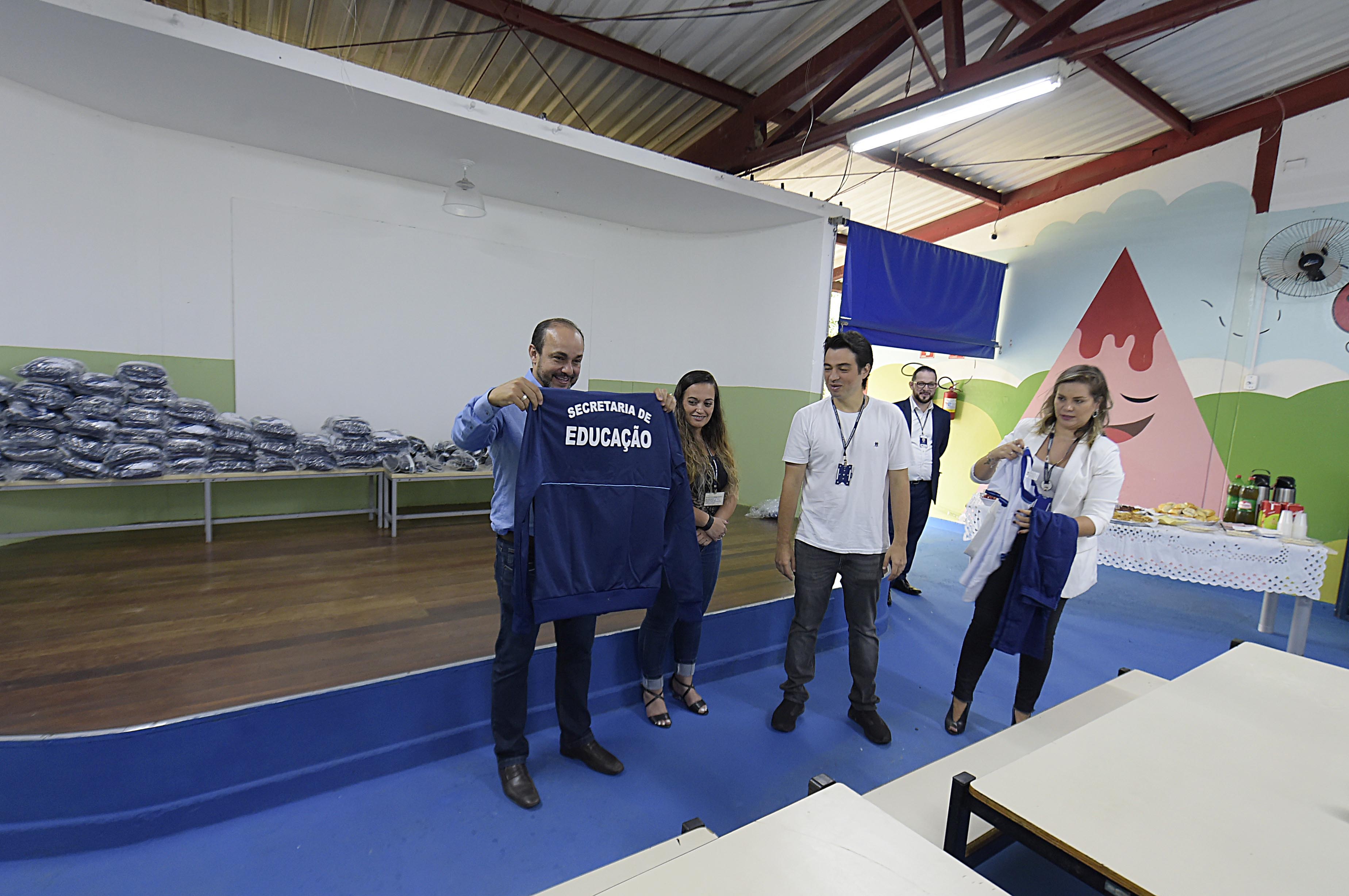 Na manhã desta segunda-feira (3), durante reunião de equipe escolar, o prefeito Guti e o secretário de Educação, Paulo Matheus, realizaram a entrega de uniformes para os professores das EPGs Celso Furtado, Jocymara de Falchi Jorge e Tia Carmela. Na oportunidade, foram disponibilizados cerca de 6 mil kits de uniformes para todos os servidores das áreas administrativa, pedagógica e de apoio escolar.