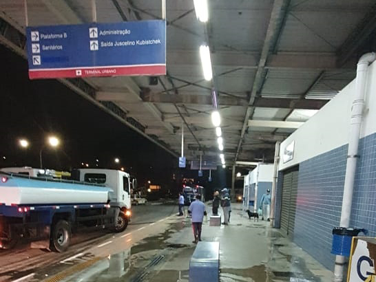 Dois dos terminais que receberam um tratamento especial estão entre os mais movimentados do município: Pimentas e São João. Com carros-bomba e mangueiras de alta potência, os funcionários lavaram todos os boxes de paradas de ônibus, além dos pontos de espera dos passageiros.