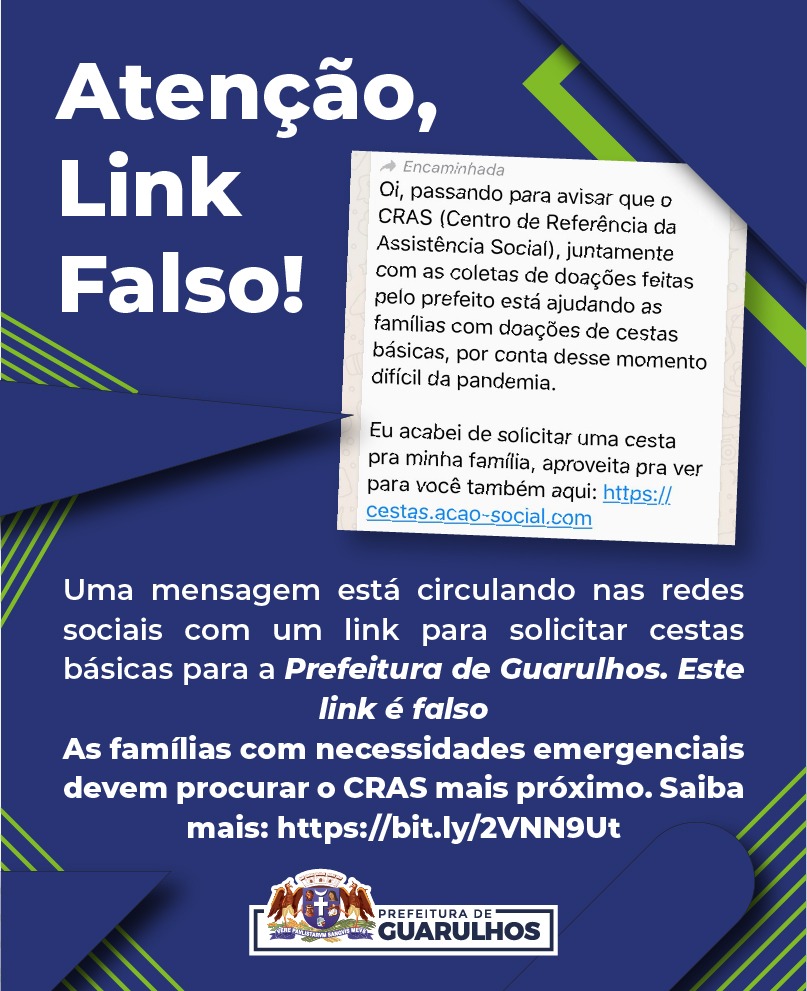 A Secretaria de Desenvolvimento e Assistência Social de Guarulhos informa que estão circulando informações falsas nas mídias sociais sobre a distribuição de cestas básicas emergenciais durante do período de pandemia da Covid-19. Ao contrário do que as fake news comunicam, os alimentos doados pela população e por empresas estão compondo cestas emergenciais elaboradas pelo Fundo Social de Solidariedade e que são entregues às famílias vulneráveis por meio das 11 unidades dos Centros de Referência da Assistência Social (Cras). As cestas não estão sendo levadas diretamente às residências, conforme a informação falsa.