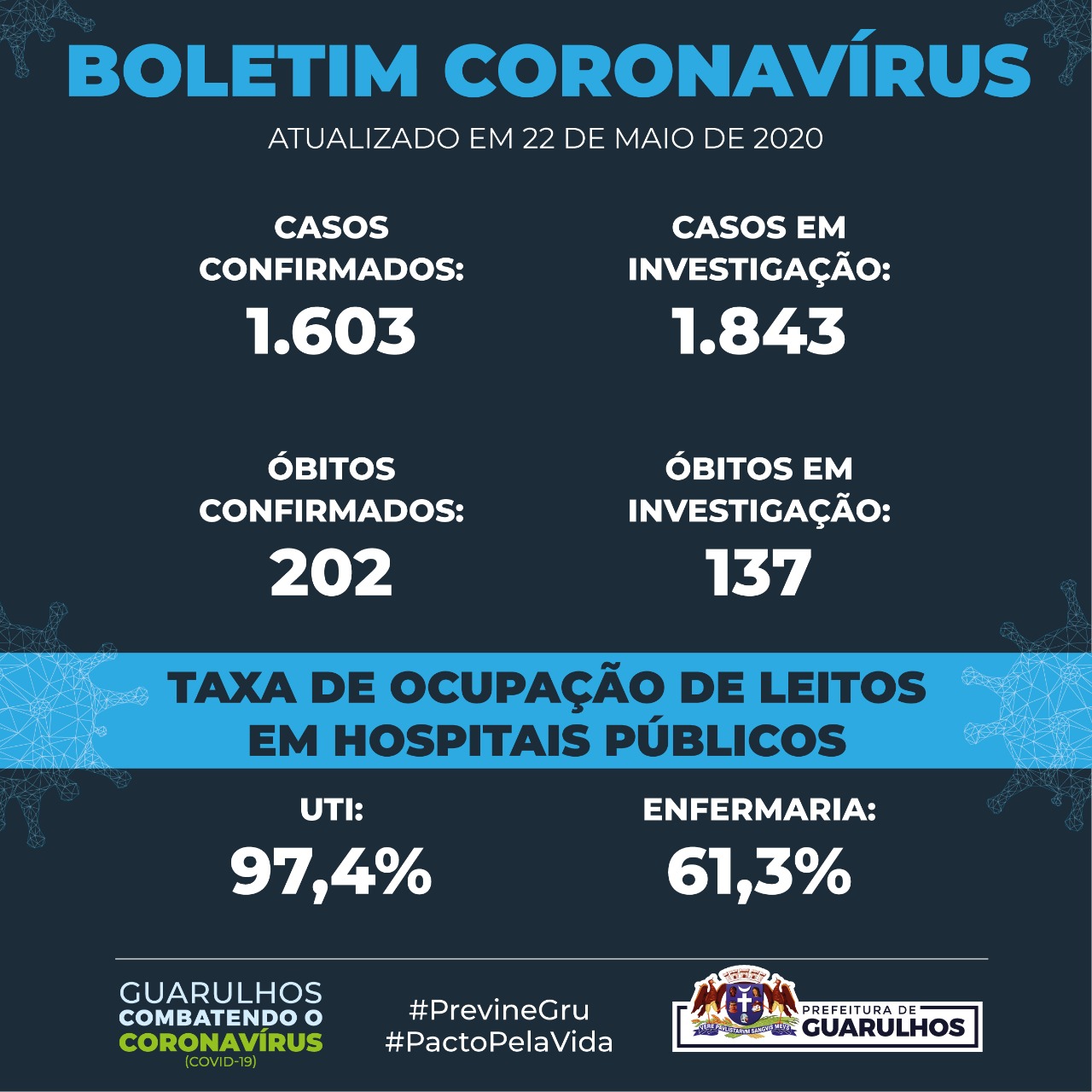 Nesta sexta-feira (22) o Boletim Epidemiológico divulgado pela Secretaria da Saúde de Guarulhos traz a confirmação de mais 11 óbitos causados pelo coronavírus (Covid-19), totalizando 202. É quase o dobro do que o registrado há 15 dias, quando a cidade contabilizava 102 mortes. Já os casos confirmados, que em 7 de maio eram 800, mais do que dobraram, chegando a 1.603, enquanto outros 1.843 seguem em investigação.