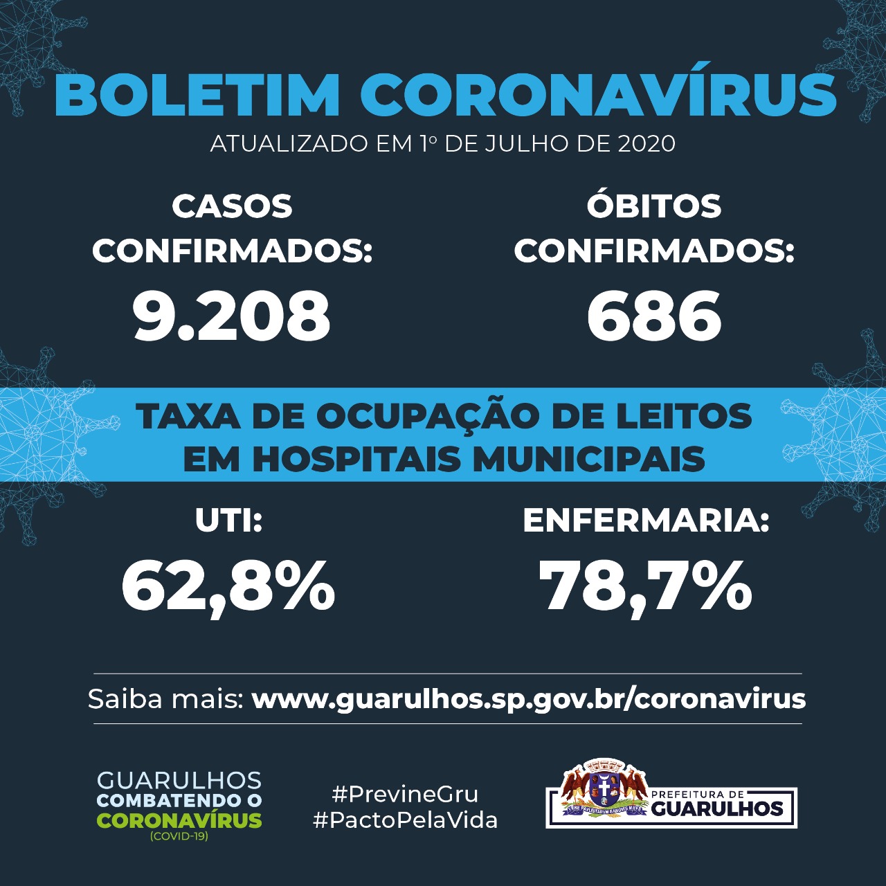De acordo com os dados do Boletim Epidemiológico divulgado pela Secretaria da Saúde nesta quarta-feira (1º), desde o início da pandemia do novo coronavírus até o momento Guarulhos soma 9.208 casos confirmados e 686 mortes por Covid-19. Dos novos óbitos contabilizados, dois deles aconteceram em abril e estavam sob investigação. Os demais ocorreram em junho.