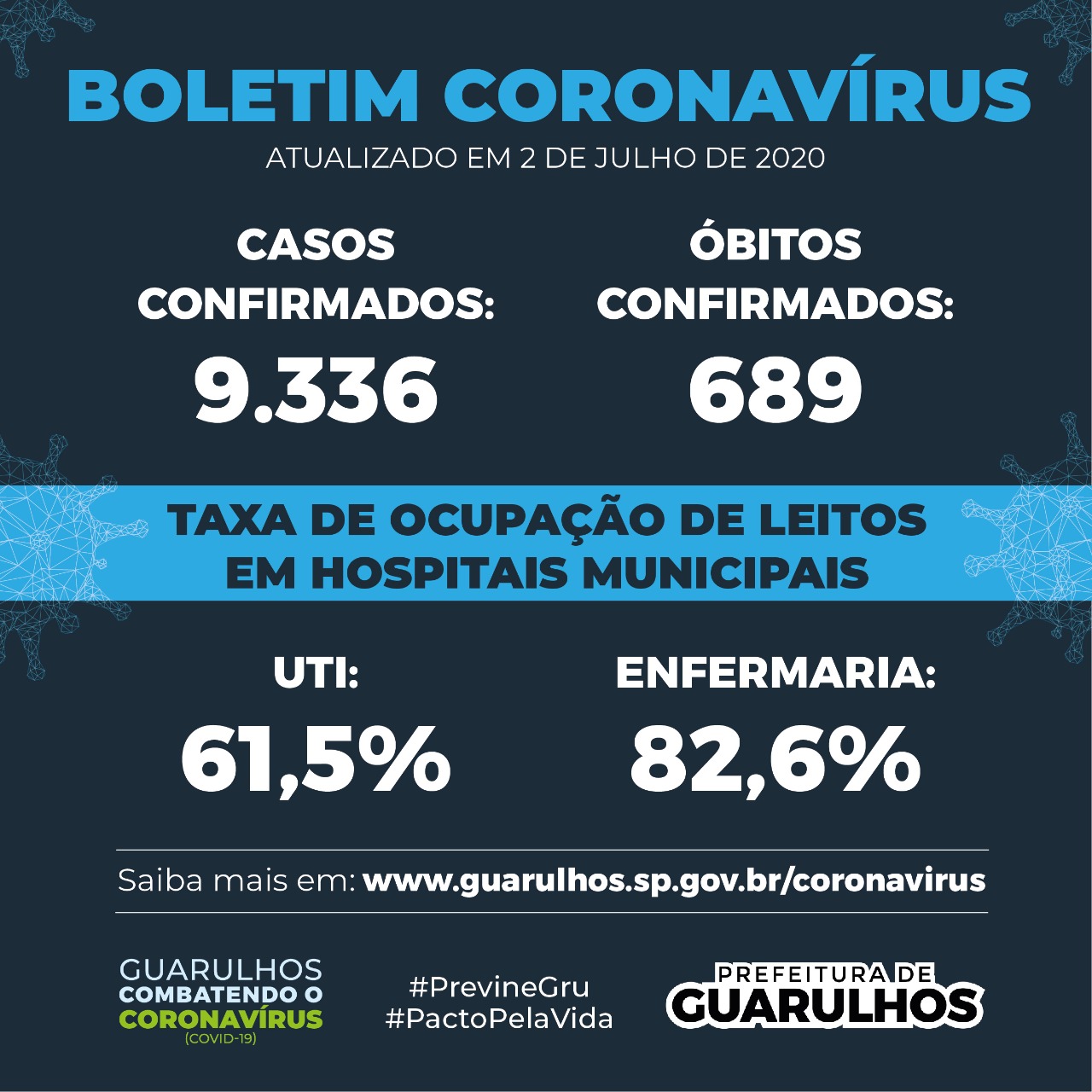 O Boletim Epidemiológico da Secretaria da Saúde de Guarulhos desta quinta-feira (2) traz uma boa notícia no meio de tantas histórias tristes diante da pandemia do novo coronavírus, que já entra no seu quarto mês no Brasil. No município, dos 9.336 casos confirmados de Covid-19 até o momento, 85% dos infectados foram curados, o que equivale a 7.935 pessoas. Outros 712 pacientes permanecem em tratamento, mas 689 moradores da cidade não resistiram e morreram.