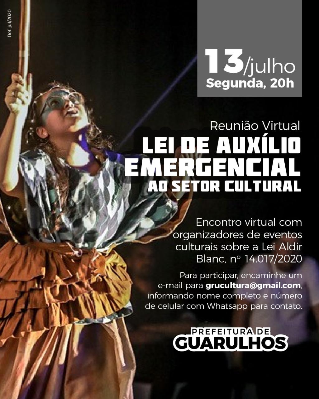 Com o objetivo de fortalecer e preparar o setor cultural para o recebimento do auxílio emergencial, a Prefeitura de Guarulhos, por meio da Secretaria de Cultura, realiza na próxima segunda-feira (13), às 20h, mais um encontro virtual, desta vez com organizadores de eventos culturais da cidade. A Lei de Emergência Cultural Aldir Blanc garante a destinação de um total de R$ 3 bilhões a estados e municípios para pagamento de renda emergencial a profissionais da cadeia do setor cultural, dentre os quais artistas, produtores e técnicos, entre outros.