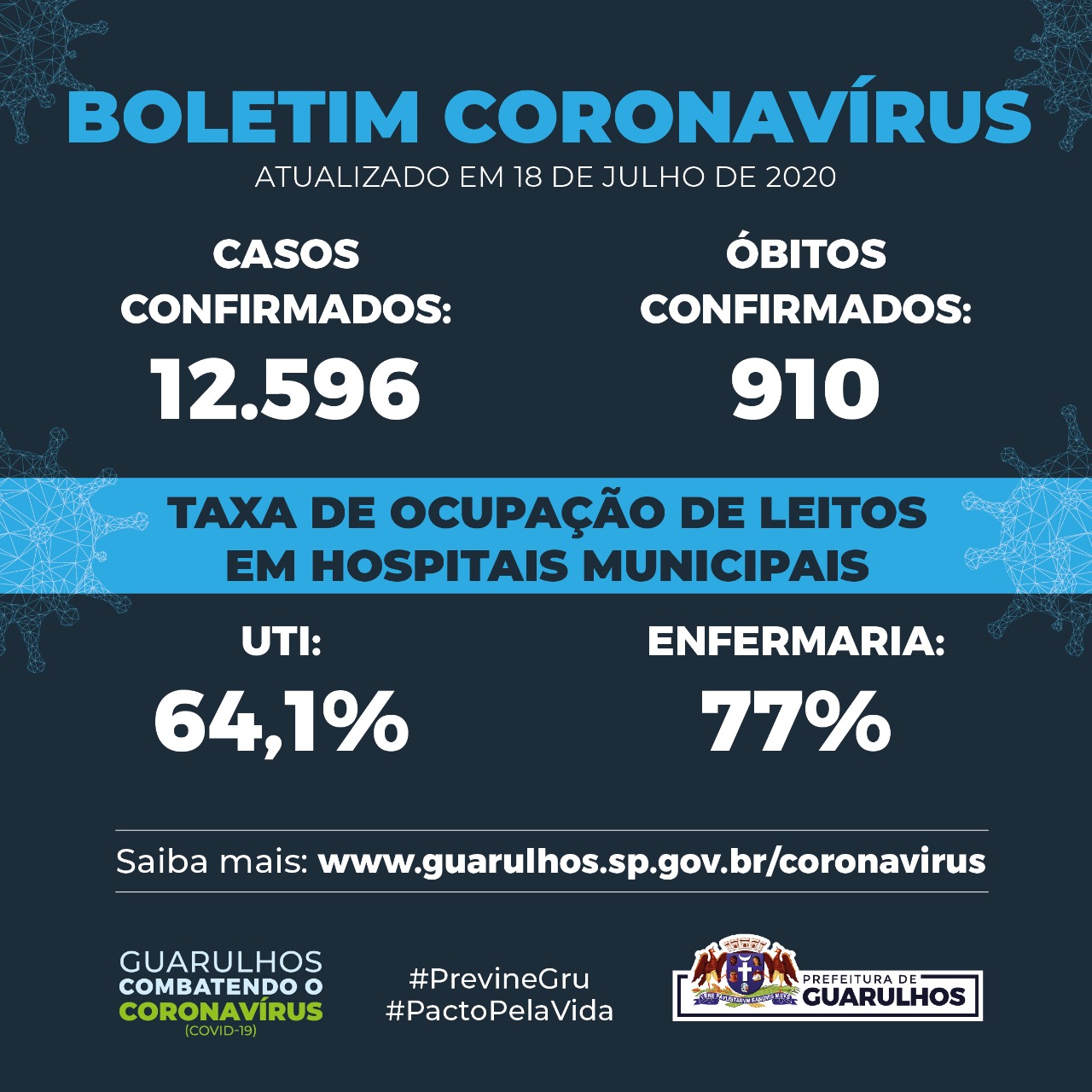 A Secretaria da Saúde de Guarulhos confirmou nas últimas 24 horas mais seis mortes por Covid-19 na cidade, totalizando 910 vidas perdidas para a doença. Destas, duas ocorreram em maio e quatro em julho, sendo cinco mulheres e um homem. Três tinham entre 50 e 59 anos, um entre 20 e 29, um entre 70 e 79 e um com mais de 80 anos. Outras 17 mortes estão em investigação.