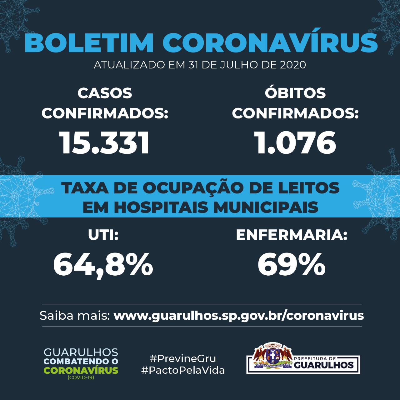 Nesta sexta-feira (31) a taxa de ocupação de leitos de UTI para o tratamento da Covid-19 caiu para 64,8% em Guarulhos, uma diferença de 5,4 pontos percentuais em relação ao dia anterior. No que se refere às vagas de enfermaria houve uma pequena elevação: de 67,4% para 69% nesta data.
