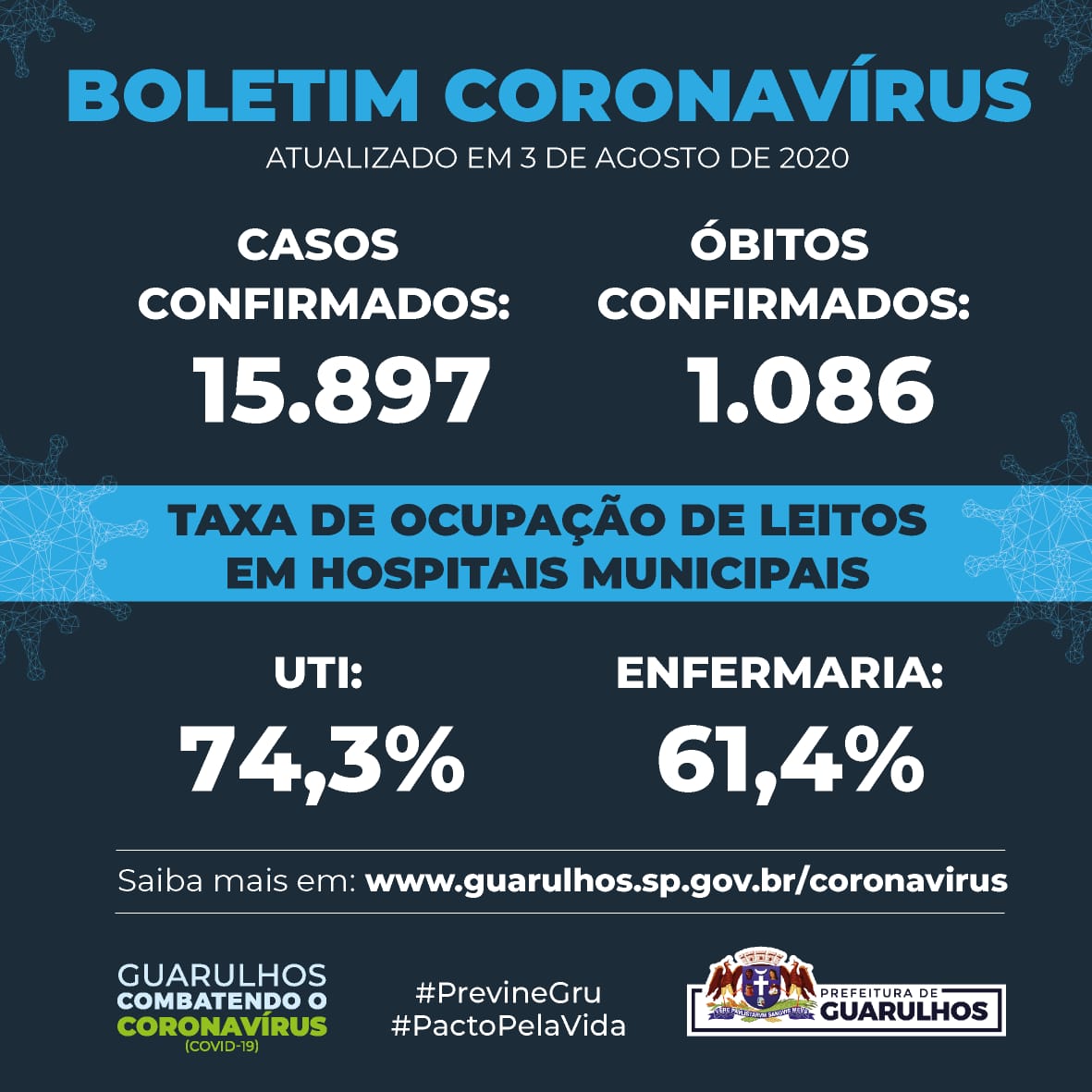 Nos demais hospitais sob gestão municipal a taxa de ocupação de leitos de UTI para Covid-19 ficou em 74,3%, enquanto a de enfermaria se manteve em 61,4%. De acordo com o Boletim Epidemiológico desta segunda-feira, mais sete mortes pelo novo coronavírus foram confirmadas em Guarulhos, todos elas ocorridas em julho. Dos sete óbitos confirmados constam três mulheres e quatro homens, sendo que dois deles foram registrados na faixa etária de 60 a 69 anos e cinco entre pessoas de 70 a 79 anos.