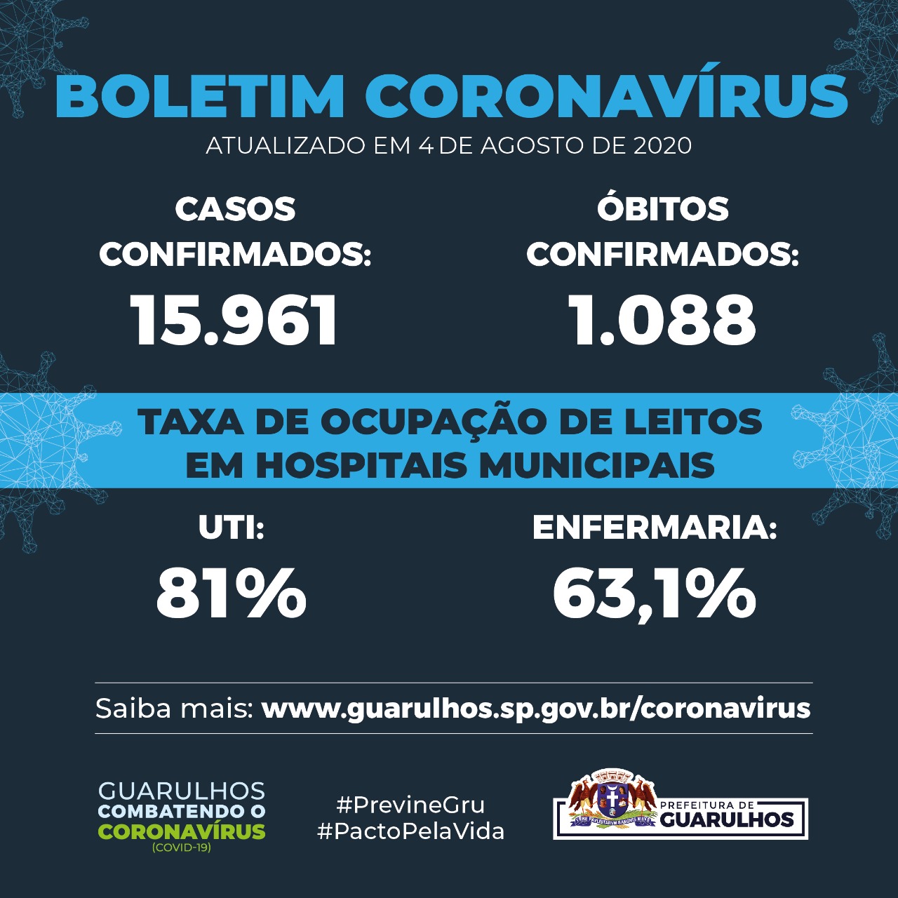 O Boletim Epidemiológico divulgado pela Secretaria da Saúde de Guarulhos nesta terça-feira (4) revela que 15.961 pessoas já foram diagnosticadas com o novo coronavírus na cidade. Enquanto isso, os indicadores de cura estão em 89,6%, enquanto que a letalidade é de 6,8% nesta data, quando mais quatro pessoas receberam alta do Hospital de Campanha do município (3C-GRU).