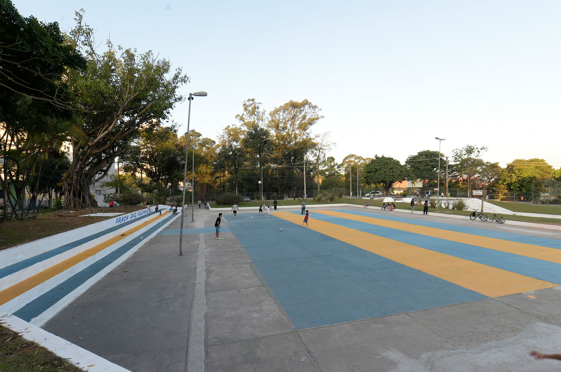 O pátio principal da praça recebeu pintura no solo, com demarcações para a prática de ginástica, futebol e danças, que são realizadas no local no período noturno, entre segunda e sexta-feira.