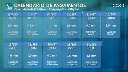 A partir deste sábado, 7,6 milhões de beneficiários nascidos em outubro e novembro poderão sacar o benefício nas máquinas de autoatendimento, nas unidades lotéricas e nos correspondentes CAIXA Aqui, além de transferir valores para contas da CAIXA ou de outros bancos, de acordo com o Ciclo 1 do calendário de pagamentos.