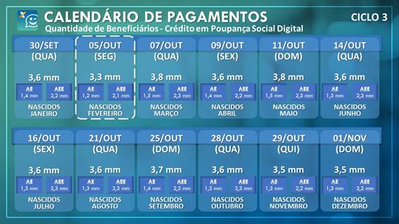 A CAIXA realiza nesta segunda-feira (05/10) o pagamento de R$ 1,5 bilhão na Poupança Social Digital para 3,3 milhões de brasileiros nascidos em fevereiro do Ciclo 3.