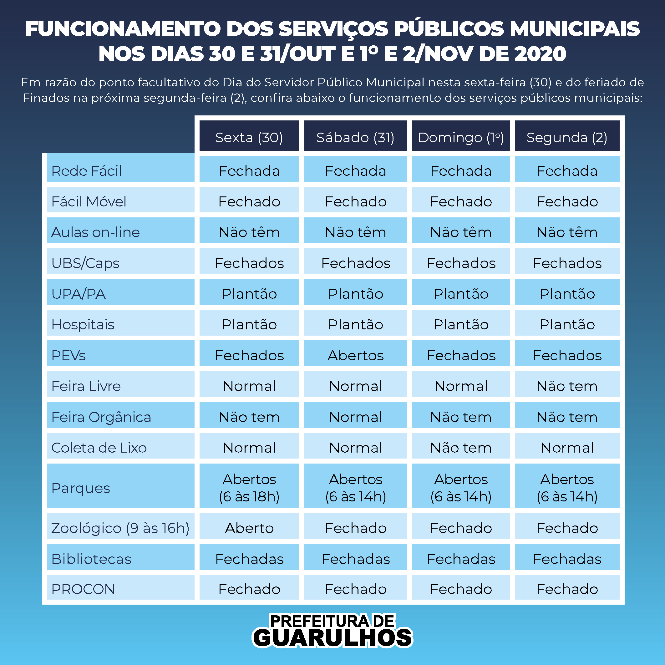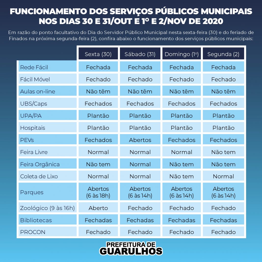 Funcionamento dos serviços públicos municipais nos feriados do Servidor e Finados outubro 29, 2020 Atualizado: outubro 29, 2020 Compartilhar WhatsAppFacebookTwitterLinkedin Com o ponto facultativo do Dia do Servidor nesta sexta-feira (30) e o feriado nacional do Dia dos Finados na próxima segunda-feira (2), veja, no arquivo em anexo, como funcionarão os serviços públicos municipais em Guarulhos nesse período. Compartilhar WhatsAppFacebookTwitterLinkedin Em alta Destaque Saúde promove capacitação em segurança alimentar ao longo de 2026 fevereiro 10, 2026 Destaque CPTM e Metrô terão operação 24 horas para o Carnaval 2026 fevereiro 10, 2026 Política Diretor Jurídico do BRB deixa cargo após caso Banco Master fevereiro 10, 2026 Destaque Projeto Cidadania Itinerante leva serviços públicos ao Bosque Maia e ao CEU Pimentas fevereiro 10, 2026 Notícias relacionadas Destaque Saúde promove capacitação em segurança alimentar ao longo de 2026 fevereiro 10, 2026 Destaque CPTM e Metrô terão operação 24 horas para o Carnaval 2026 fevereiro 10, 2026 Política Diretor Jurídico do BRB deixa cargo após caso Banco Master fevereiro 10, 2026 Destaque Projeto Cidadania Itinerante leva serviços públicos ao Bosque Maia e ao CEU Pimentas fevereiro 10, 2026