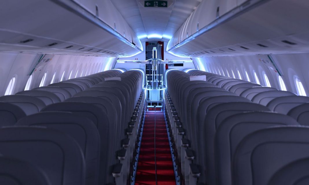 A UVeya está testando a tecnologia em jatos da Helvetic Airways e o robô consegue desinfetar um avião de um corredor em 13 minutos.