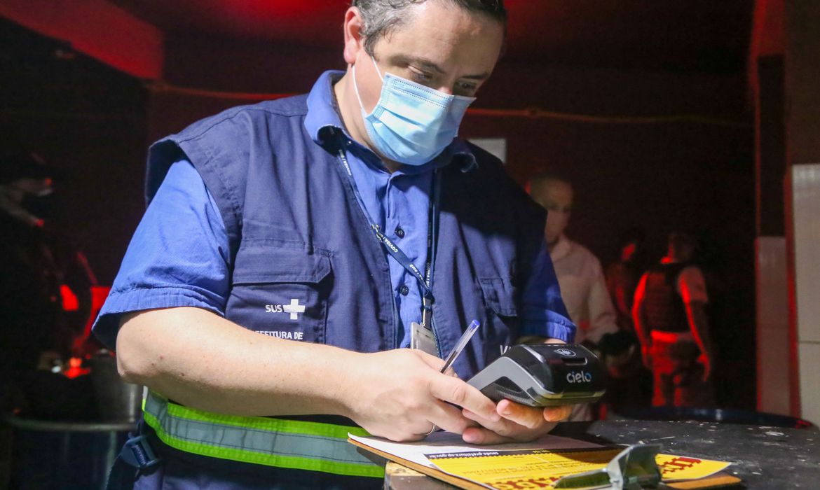 Na madrugada de ontem, os agentes de fiscalização encontraram 150 pessoas aglomeradas em um bar na região de Arincaduva, zona leste de São Paulo. Na ação, 17 pessoas foram detidas, inclusive o proprietário do bar. No local, ocorria uma festa com DJ e banda.