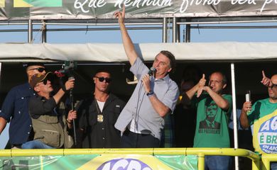 Antes de subir no trio elétrico, Bolsonaro cumprimentou apoiadores. Mais cedo, o presidente tinha almoçado no Centro de Tradições Gaúchas de Brasília, com representantes do agronegócio que organizaram o protesto.