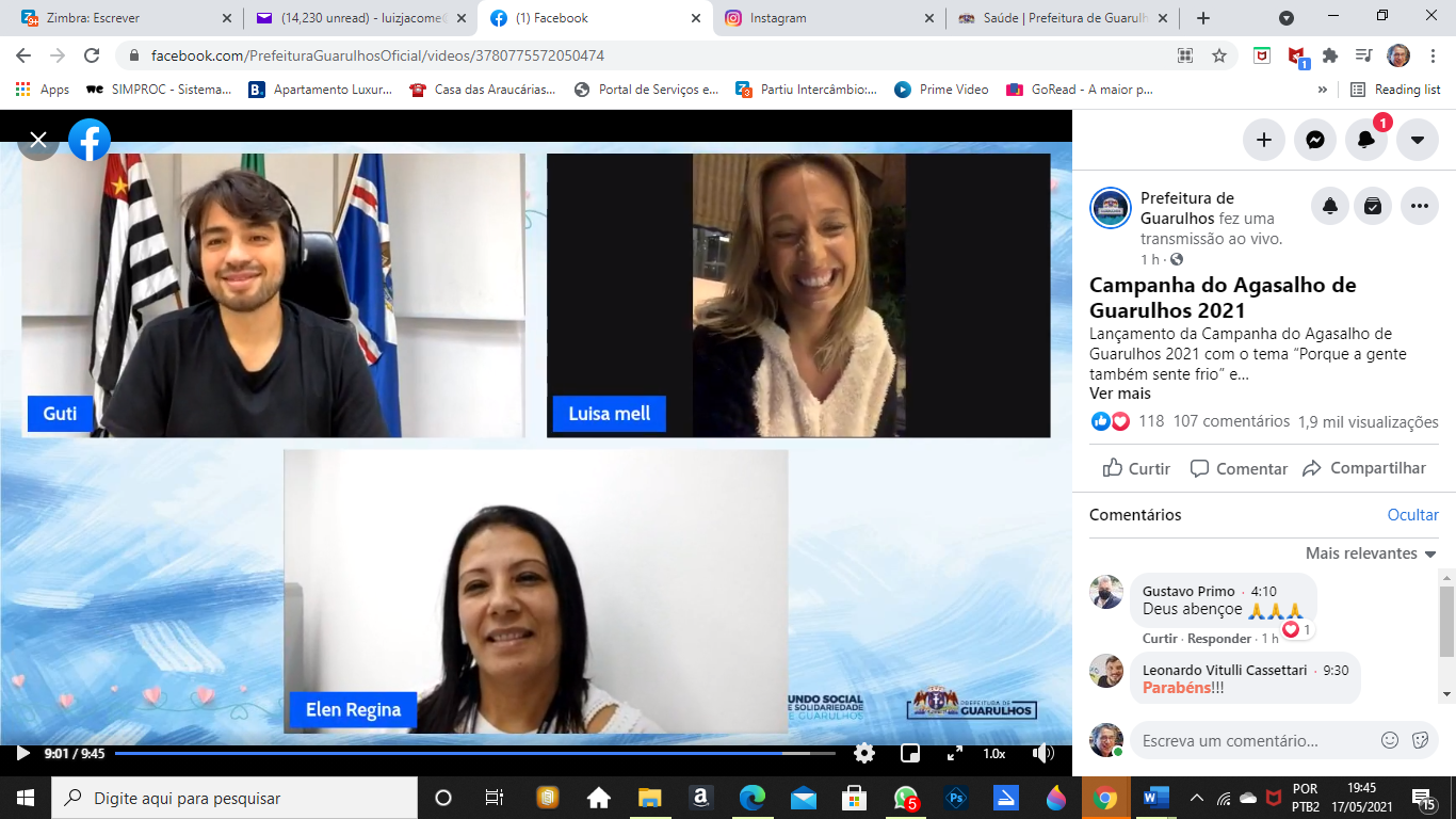 Em sua live no Facebook da Prefeitura, Guti contou com a participação da ativista da causa animal Luisa Mell, que é a garota propaganda da campanha, e da presidente do Fundo Social, Elen Farias. O prefeito ressaltou a importância dessa iniciativa para atenuar o sofrimento que muitas pessoas passam nesse período do ano, ainda mais agravado pela situação do momento com a pandemia, e ainda fez questão de agradecer o apoio de Luisa Mel, que está emprestando sua imagem gratuitamente à campanha, bem como a toda equipe da Prefeitura à frente desse trabalho. “A campanha do agasalho é fundamental para auxiliar a quem precisa de ajuda para enfrentar o frio e a participação de todos é importantíssima. E agradeço muito a você (Luisa) pela atitude de participar e nos ajudar em nossa campanha dessa forma”, enalteceu.