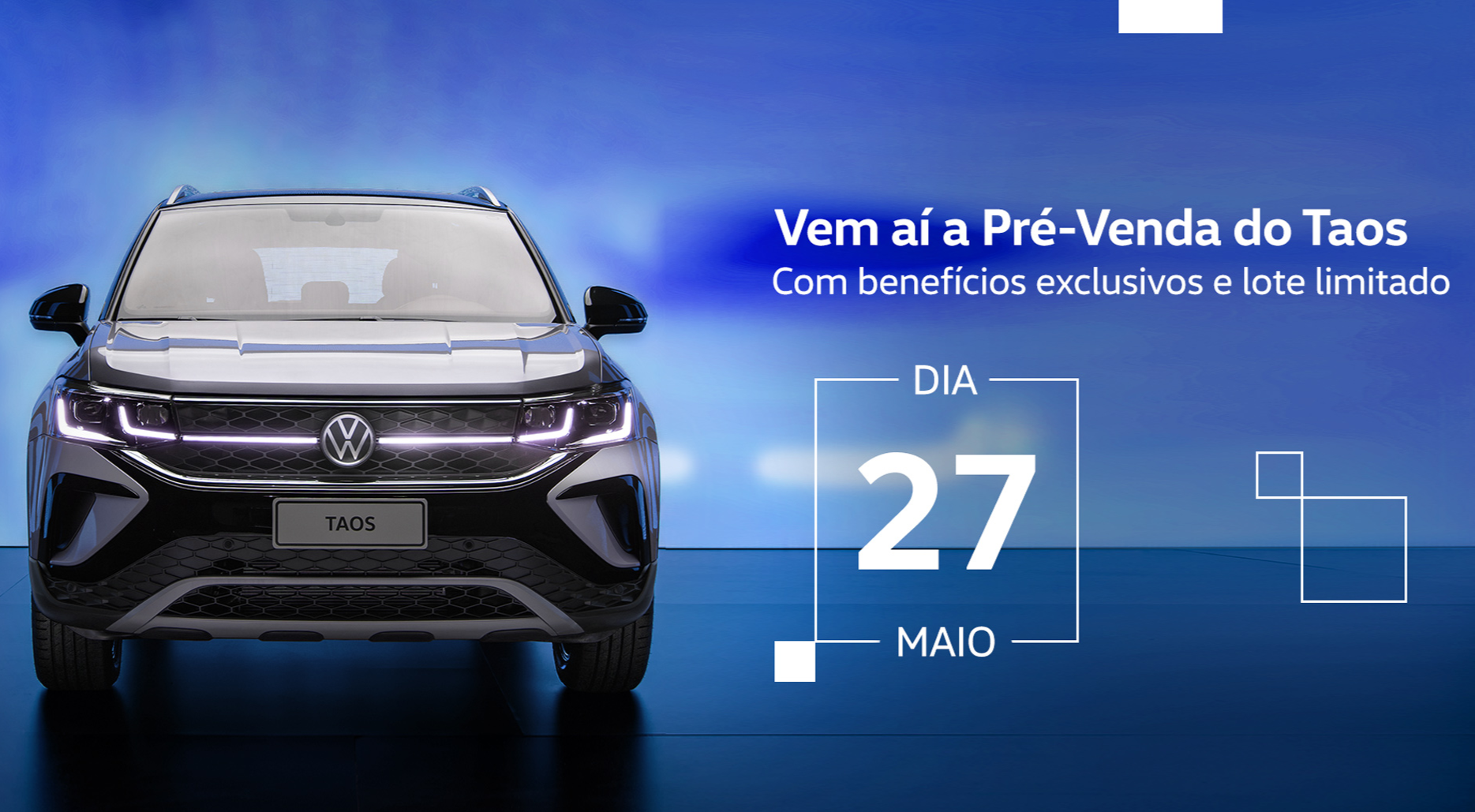 No dia do lançamento do VW Taos, marcado para 27 de maio, às 12h, a Volkswagen do Brasil também inicia a pré-venda do modelo com unidades limitadas e benefícios exclusivos.