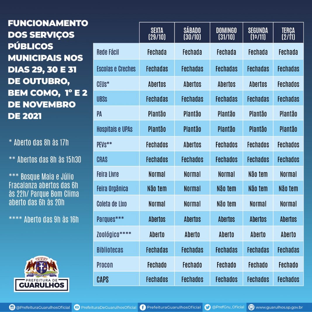 Em razão do feriado do Dia do Servidor (28/10), transferido para sexta-feira (29/10), do ponto facultativo na segunda-feira (1º/11) e do Dia de Finados celebrado na terça-feira (2/11), confira no anexo o funcionamento dos serviços públicos municipais em Guarulhos nesse período.