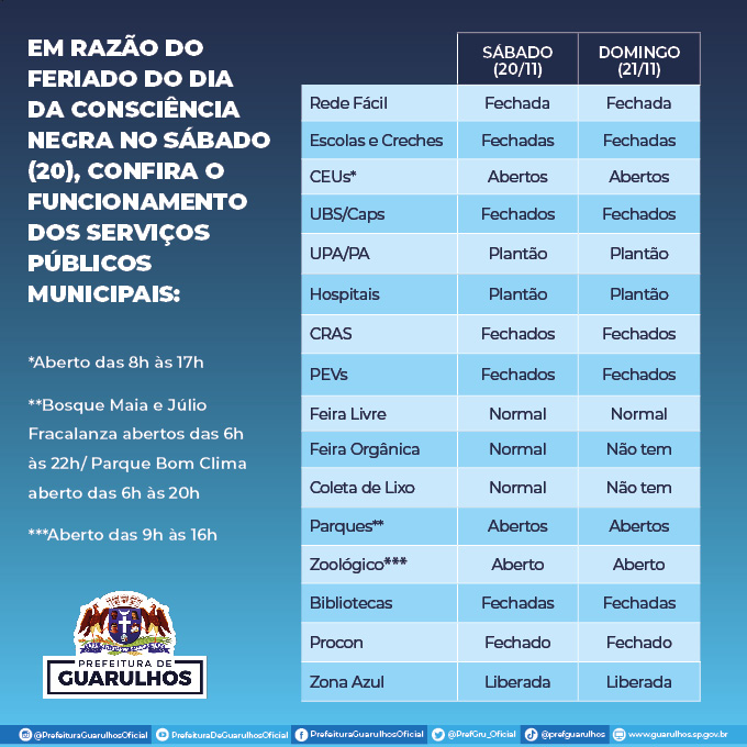 Em razão do feriado do Dia da Consciência Negra neste sábado (20), confira no anexo o funcionamento dos serviços públicos municipais em Guarulhos neste fim de semana. novembro 18, 2021 Atualizado: novembro 18, 2021 Compartilhar WhatsAppFacebookXLinkedin Compartilhar WhatsAppFacebookXLinkedin Em alta Destaque Prefeitura de Guarulhos entrega mais 76 ônibus com ar-condicionado e amplia número para 96 somente em 2026 no “Programa Geladão” março 26, 2026 Política Mostra “Quadrinistas Brasileiros” fica em cartaz durante o mês de abril na Biblioteca Monteiro Lobato março 26, 2026 brasil Operação da PF combate lavagem de dinheiro e evasão de divisas março 26, 2026 Cidade Defesa Civil alerta para pancadas de chuva e risco de temporais isolados nesta quinta (26) e sexta (27) março 26, 2026 Notícias relacionadas Destaque Prefeitura de Guarulhos entrega mais 76 ônibus com ar-condicionado e amplia número para 96 somente em 2026 no “Programa Geladão” março 26, 2026 Política Mostra “Quadrinistas Brasileiros” fica em cartaz durante o mês de abril na Biblioteca Monteiro Lobato março 26, 2026 brasil Operação da PF combate lavagem de dinheiro e evasão de divisas março 26, 2026 Cidade Defesa Civil alerta para pancadas de chuva e risco de temporais isolados nesta quinta (26) e sexta (27) março 26, 2026