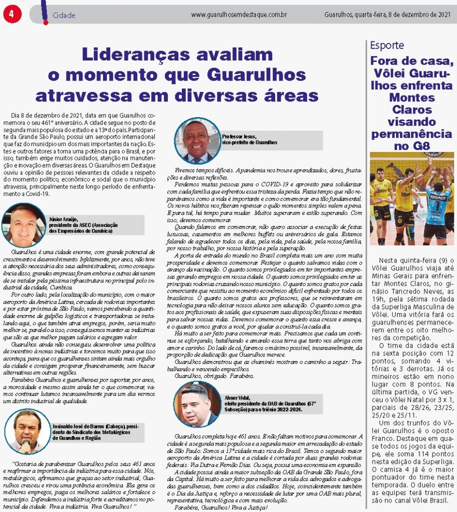 Lideranças avaliam o momento que Guarulhos atravessa em diversas áreas dezembro 8, 2021 Atualizado: dezembro 8, 2021 Compartilhar WhatsAppFacebookTwitterLinkedin Compartilhar WhatsAppFacebookTwitterLinkedin Em alta Cidade Consumo de álcool durante tratamento psiquiátrico pode oferecer risco à saúde fevereiro 16, 2026 Cidade Obesidade infantil causa danos vasculares precoces, indica estudo com crianças paulistas fevereiro 16, 2026 Esporte Jogos de Inverno: Brasil encerra campanha histórica no esqui alpino fevereiro 16, 2026 Esporte Com João Fonseca, brasileiros disputam chaves principais do Rio Open fevereiro 16, 2026 Notícias relacionadas Cidade Consumo de álcool durante tratamento psiquiátrico pode oferecer risco à saúde fevereiro 16, 2026 Cidade Obesidade infantil causa danos vasculares precoces, indica estudo com crianças paulistas fevereiro 16, 2026 Esporte Jogos de Inverno: Brasil encerra campanha histórica no esqui alpino fevereiro 16, 2026 Esporte Com João Fonseca, brasileiros disputam chaves principais do Rio Open fevereiro 16, 2026