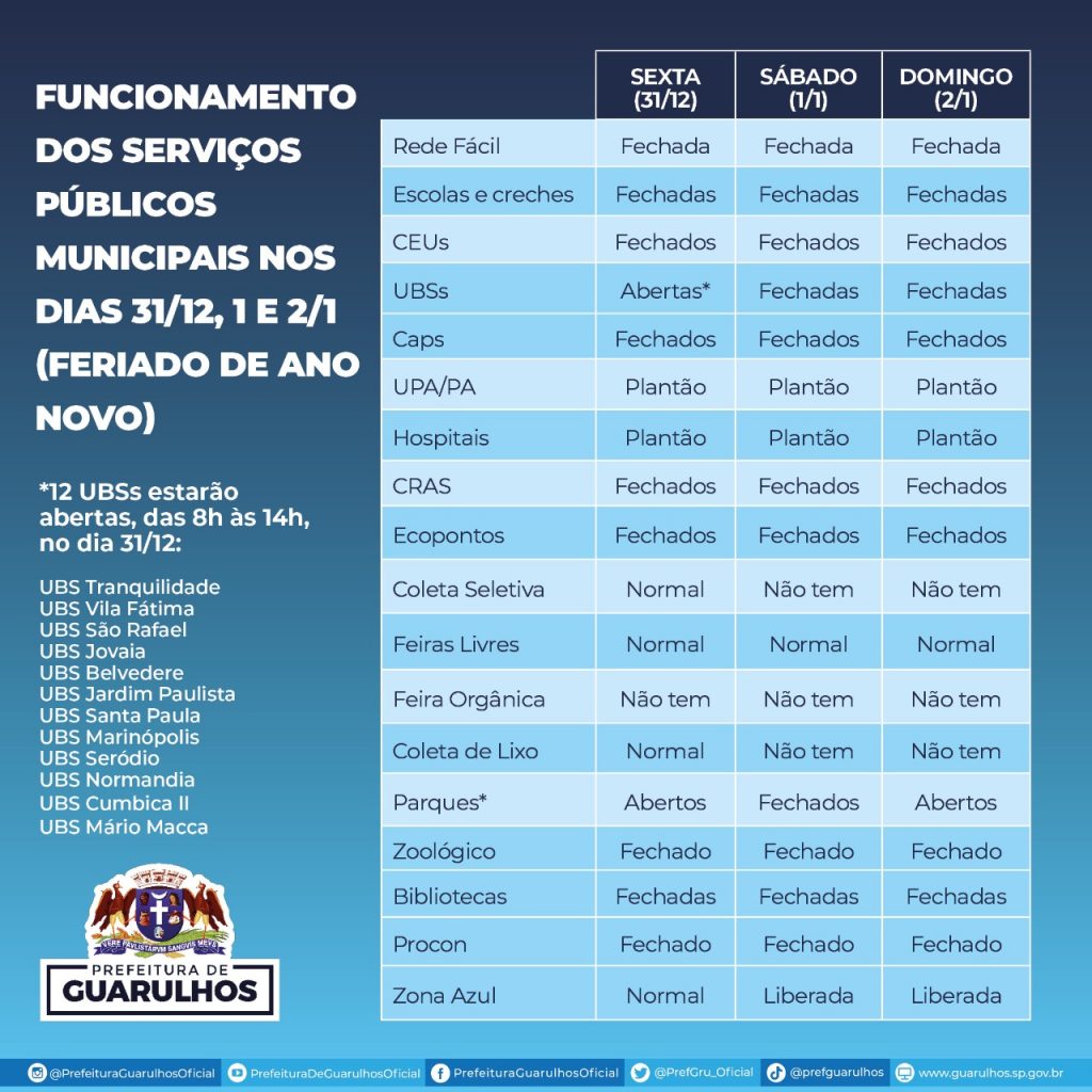 Prefeitura divulga esquema de funcionamento dos serviços municipais no período de Ano Novo em Guarulhos dezembro 31, 2021 Atualizado: dezembro 31, 2021 Compartilhar WhatsAppFacebookTwitterLinkedin Quarta, 29 de Dezembro de 2021 – 12:00 Compartilhar WhatsAppFacebookTwitterLinkedin Em alta brasil Trem chega à estação Morumbi pela primeira vez rumo à abertura da Linha 17-Ouro fevereiro 17, 2026 brasil Governo de SP leva imagens reais do Cantareira ao metrô para conscientizar sobre consumo racional de água fevereiro 17, 2026 brasil Mais de 400 jovens da Fundação CASA conquistam certificação nos ensinos fundamental e médio fevereiro 17, 2026 Esporte Luísa Stefani e Gabriela Dabrowski vencem mais uma no WTA de Dubai fevereiro 17, 2026 Notícias relacionadas brasil Trem chega à estação Morumbi pela primeira vez rumo à abertura da Linha 17-Ouro fevereiro 17, 2026 brasil Governo de SP leva imagens reais do Cantareira ao metrô para conscientizar sobre consumo racional de água fevereiro 17, 2026 brasil Mais de 400 jovens da Fundação CASA conquistam certificação nos ensinos fundamental e médio fevereiro 17, 2026 Esporte Luísa Stefani e Gabriela Dabrowski vencem mais uma no WTA de Dubai fevereiro 17, 2026