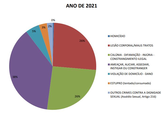 Em 2020, ano em que houve grande restrição de circulação de pessoas em razão da pandemia de covid-19, foram feitos 6.430 registros de violência contra a mulher, o que equivale a menos 46,34% em relação a 2021.