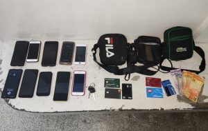 Ao avistarem os policiais, os indivíduos dispensaram três bolsas que carregavam e tentaram fugir, sendo abordados na sequência. Com dois dos detidos foram encontrados R$ 153 em espécie, um celular e um par de chaves de motocicleta. Nas bolsas, as quais foram recuperadas, foram localizados mais dez celulares, um fone de ouvido, cartões, o documento de uma moto com queixa de roubo e outro mais, pertencentes a diversas vítimas. O caso foi registrado no 3º Distrito Policial de Diadema como roubo e ato infracional equivalente ao mesmo delito.