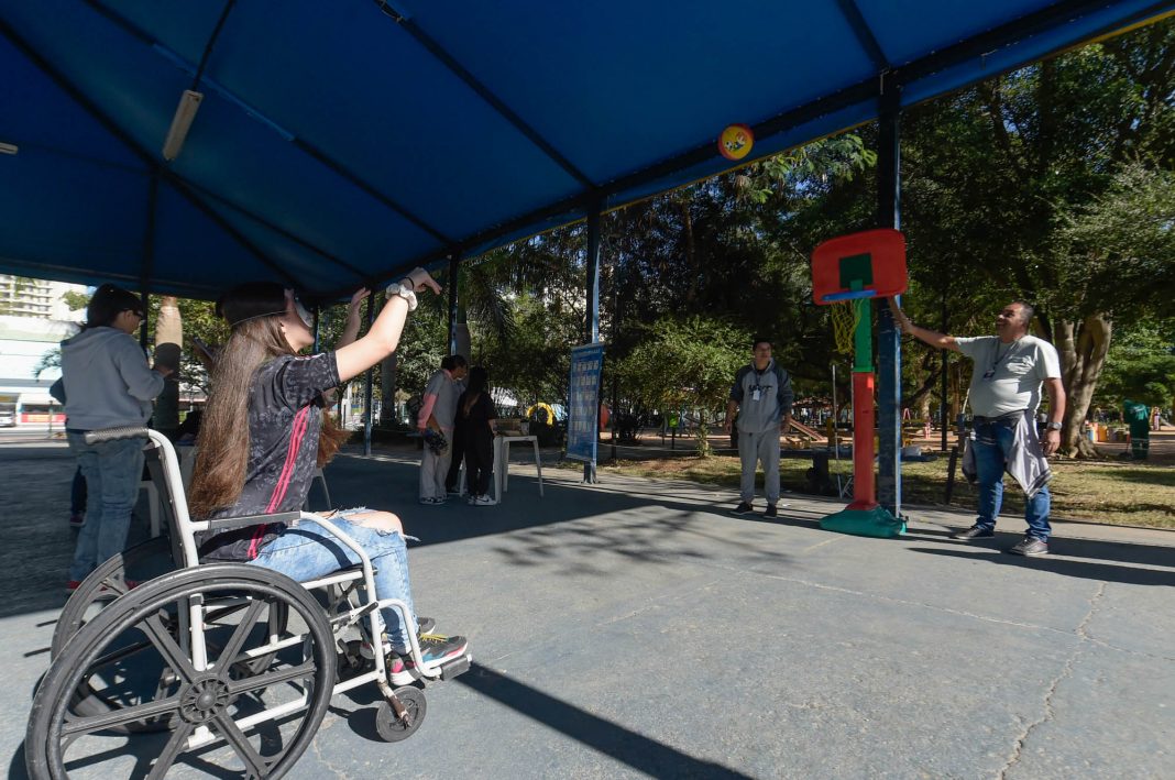Praticante de basquete, Guilherme Morais, também de 15 anos, frequenta o parque todas das manhãs e encarou o desafio do esporte na cadeira de rodas com os olhos vendados. “Foi da hora! Estou feliz que acertei a cesta. Ajudou o barulho que fizeram na tabela e procurei também me guiar pela minha mão. Como fiz o molde de arremesso (a posição das mãos), foi mais fácil de a bola ir reto”, explicou o esportista, que mora no Gopoúva.