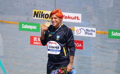 A baiana Ana Marcela Cunha conquistou, nesta segunda-feira (27), a medalha de ouro na prova de cinco quilômetros em águas abertas no Campeonato Mundial de Esportes Aquáticos, realizado em Budapeste (Hungria). A brasileira completou o percurso em 57min52s90, menos de um segundo à frente da francesa Angelie Muller, segunda colocada. A italiana Giulia Gabbrielleschi levou o bronze.