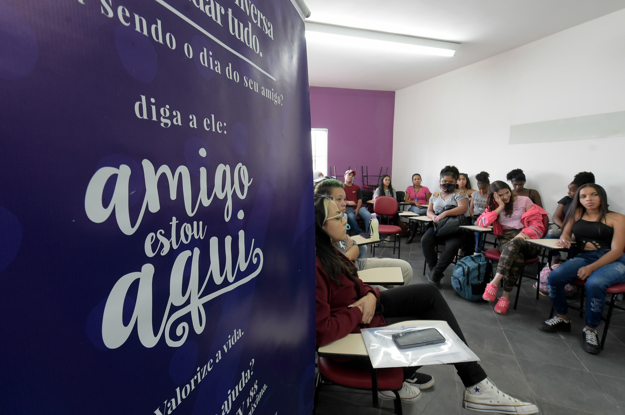 Aproximadamente 30 estudantes do ensino fundamental II e do ensino médio participaram nesta quarta-feira (29) do projeto Amigo Estou Aqui na Casa do Jovem, a sede da Subsecretaria da Juventude de Guarulhos. A iniciativa da pasta, que integra a Secretaria de Direitos Humanos, busca sensibilizar, alertar, prevenir e conscientizar adolescentes sobre depressão e suicídio.